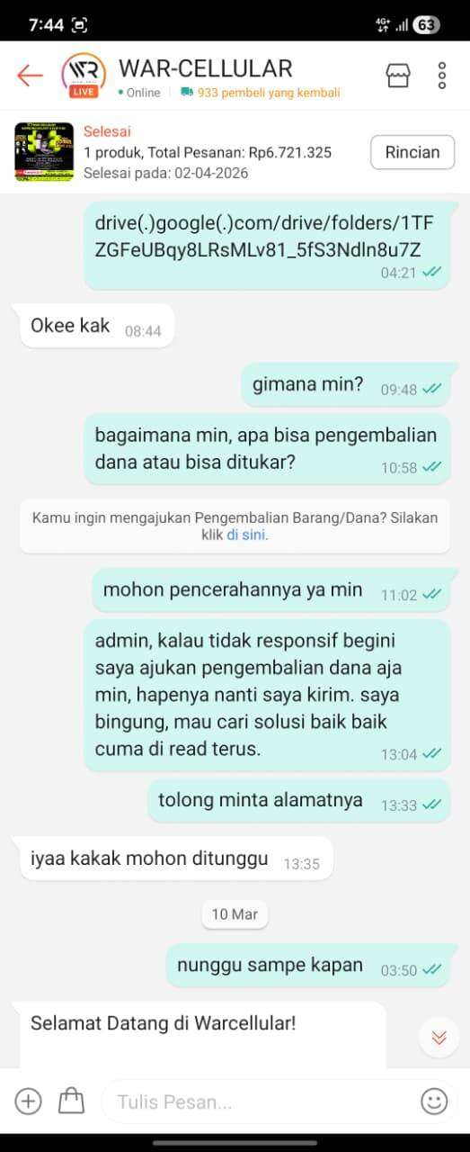 Saya mencoba menghubungi penjual, karena dalam deskripsi terdapat garansi 7 hari ganti unit selama segel belum dilepas. Namun penjual mulai slow response dan bertele-tele, sehingga saya mengajukan pengembalian dana. Bisa dilihat bahwa saya sangat sopan dan hanya ingin mencari solusi, namun penjual jarang merespons padahal terlihat selalu online.