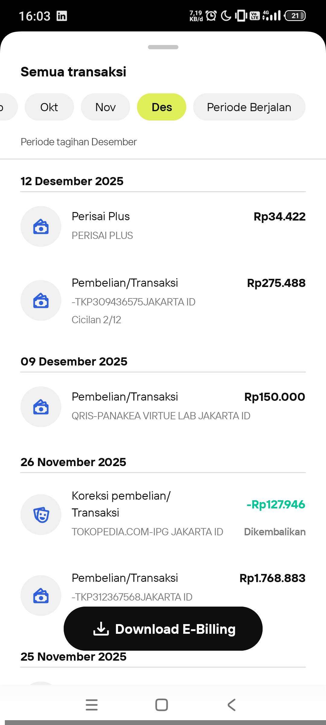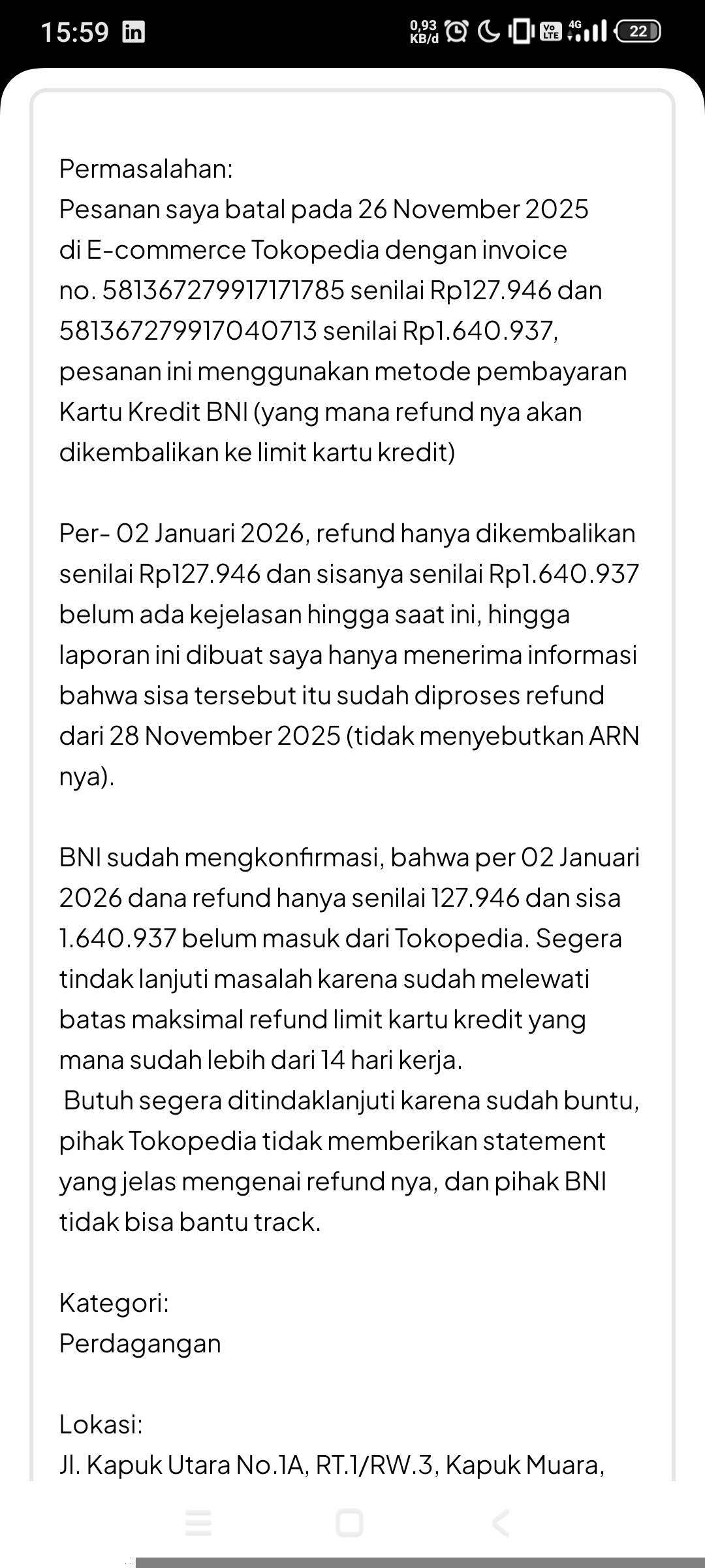 Pesanan saya batal pada 26 November 2025 di e-commerce Tokopedia dengan invoice No. 581367279917171785 senilai Rp127.946 dan No. 581367279917040713 senilai Rp1.640.937. Pesanan ini menggunakan metode pembayaran Kartu Kredit BNI, yang mana refund akan dikembalikan ke limit kartu kredit.