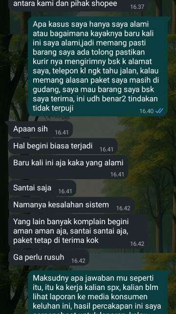 Demikian keluhan ini saya sampaikan agar menjadi perhatian serius bagi pihak terkait, khususnya SPX Express dan Shopee, supaya ada tindak lanjut yang jelas serta perbaikan pelayanan ke depannya.