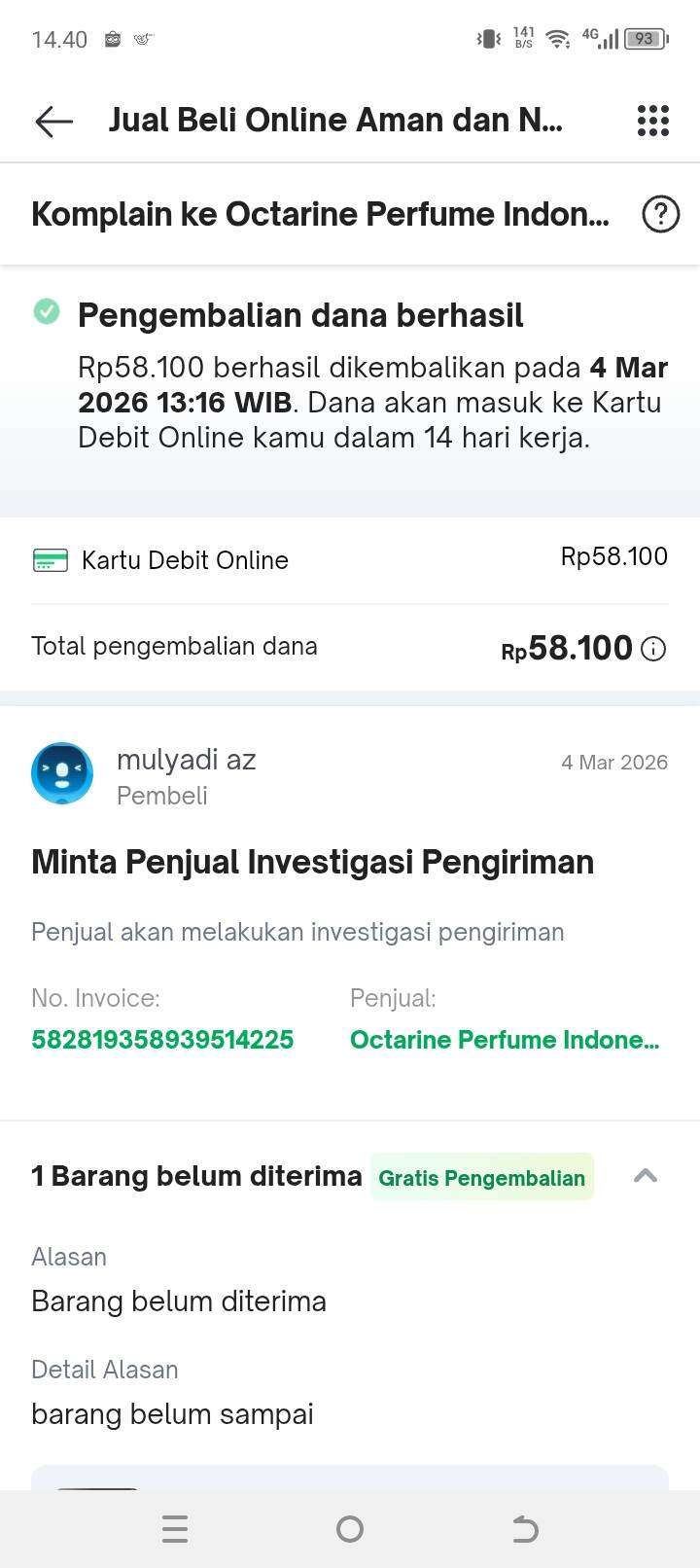 Dan pada tanggal 4 Maret 2026 sekitar pukul 11.00 saya mengajukan komplain bahwa barang belum sampai. Dan pihak penjual pada pukul 13.16 merespons menyetujui proses pengembalian uang saya, bukannya mengirim paket saya segera.