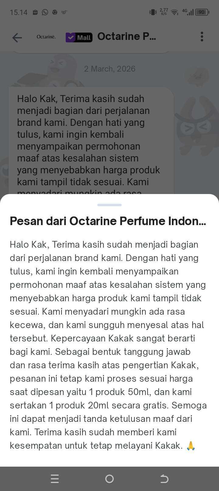 Lalu pada tanggal 2 Maret 2026, admin Octarine chat ke saya memberitahukan bahwa harga produk tidak sesuai yang disebabkan oleh kesalahan sistem.