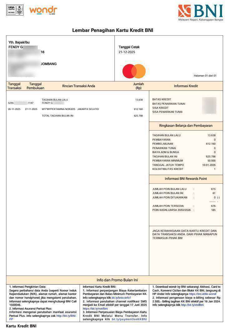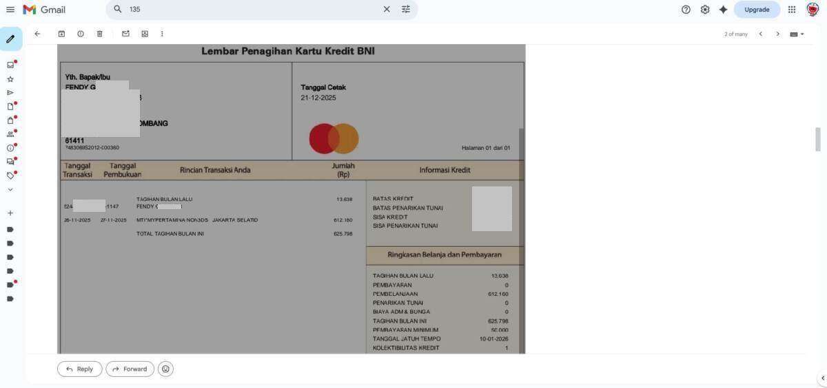 Dan beberapa hari kemudian muncul tagihan BNI, yaitu 21 Desember 2025: