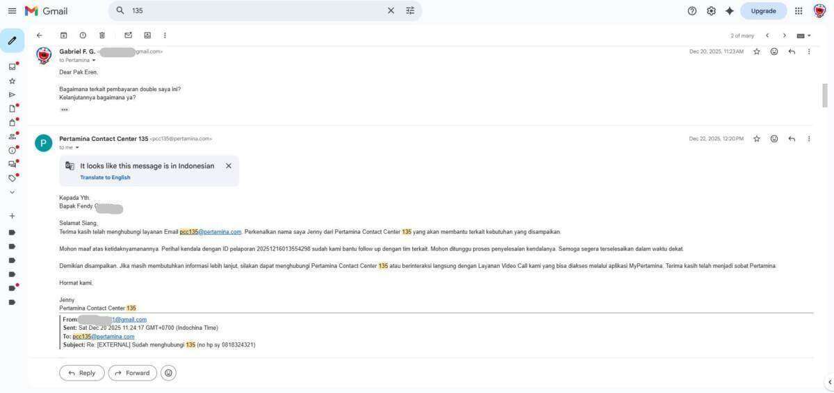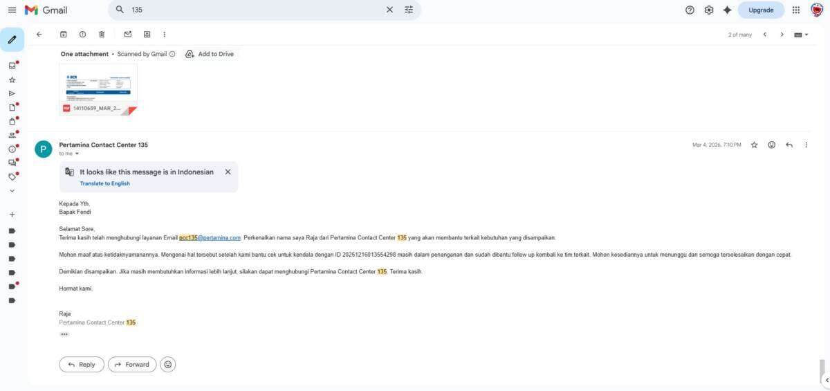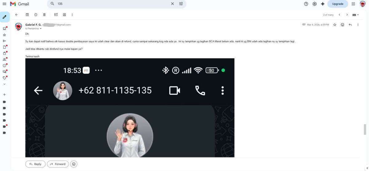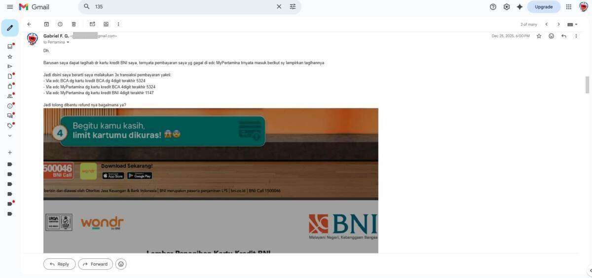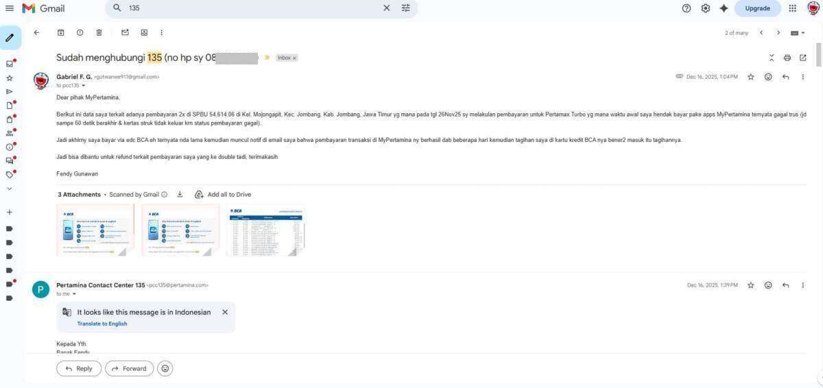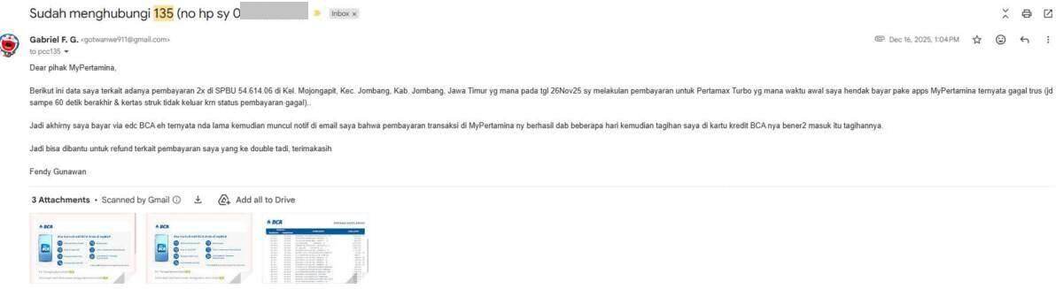 Oleh karena sebab itulah, saya melakukan komplain ke pihak 135 MyPertamina melalui telepon pada tanggal 16 Desember 2025 yang dilanjutkan melalui email terkait transaksi saya yang double bayar melalui kartu kredit BCA dan BNI. Laporan saya menunggu investigasi pihak MyPertamina pusat, yang mana sejak laporan saya per 16 Desember 2025 baru selesai investigasi itu per 26 Maret 2026.