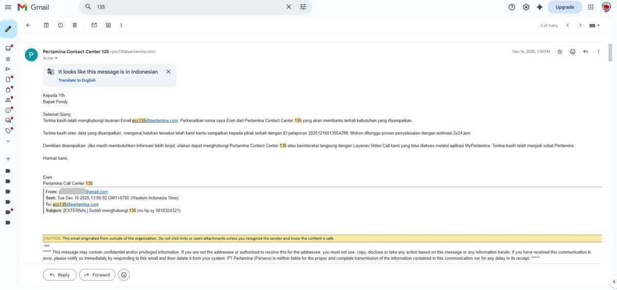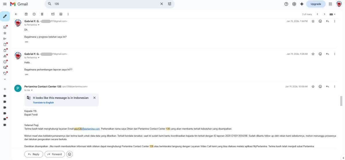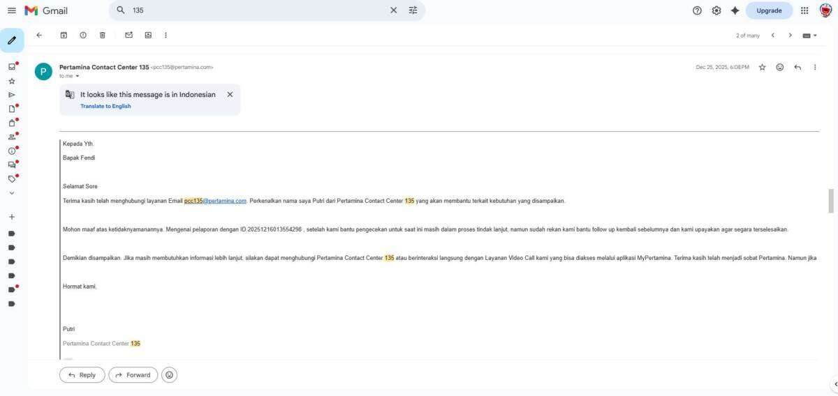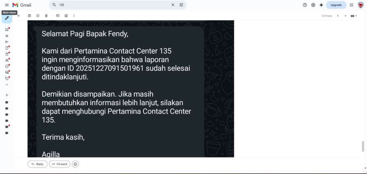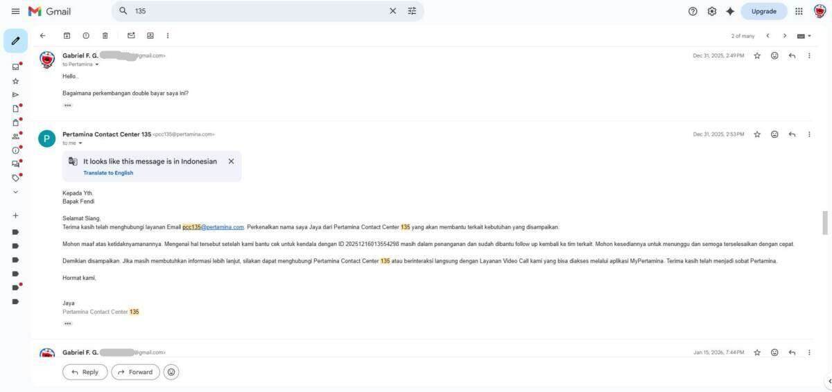 Oleh karena sebab itulah, saya melakukan komplain ke pihak 135 MyPertamina melalui telepon pada tanggal 16 Desember 2025 yang dilanjutkan melalui email terkait transaksi saya yang double bayar melalui kartu kredit BCA dan BNI. Laporan saya menunggu investigasi pihak MyPertamina pusat, yang mana sejak laporan saya per 16 Desember 2025 baru selesai investigasi itu per 26 Maret 2026.
