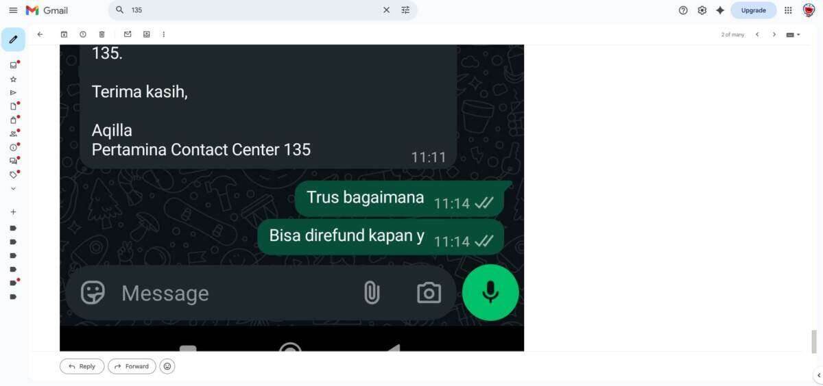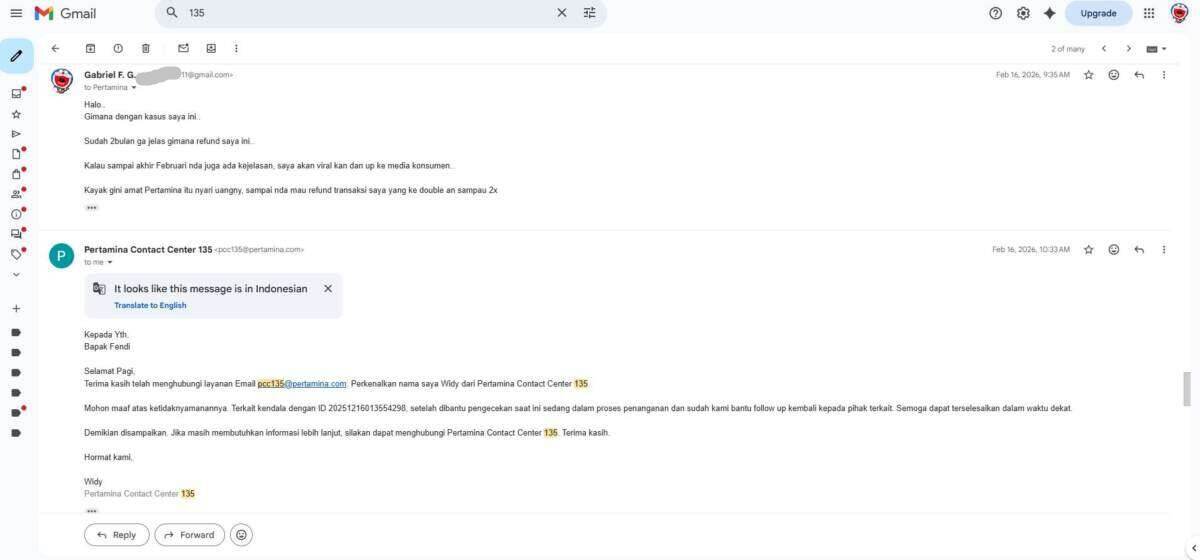 Jadi oleh MyPertamina menginformasikan untuk menghubungi bank yang bersangkutan untuk proses refund-nya. Saya lampirkan semua percakapan saya melalui email dengan pihak 135 MyPertamina di bawah ini: