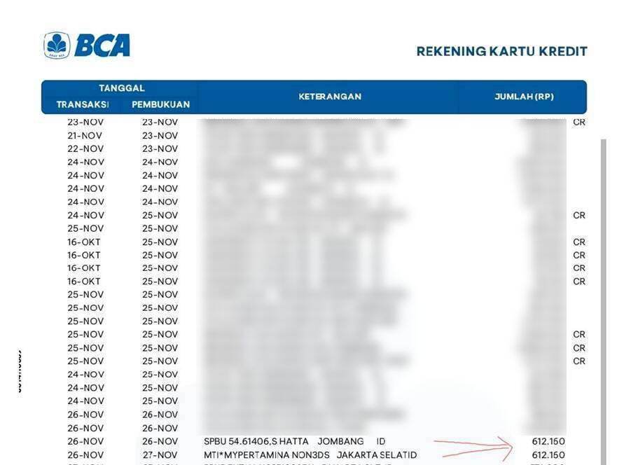 Saya selaku pemilik kartu kredit BNI berjenis Mastercard Telkomsel Platinum dengan nomor 5244 xxxx xxxx 1147 menyatakan bahwa transaksi saya di aplikasi MyPertamina pada tanggal 26 November 2025 sekitar pukul 08.50/09.00 pagi di SPBU 54.614.06 Jl. Soekarno Hatta, Kel. Mojongapit, Jombang, Jawa Timur gagal/timeout.