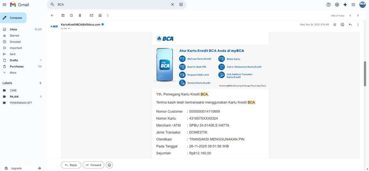 Selang 1 bulan kemudian, tepatnya 3 Desember, saya menerima tagihan kartu kredit, yang mana untuk transaksi saya di BCA itu terjadi 2 kali (saya lampirkan tagihan dari BCA), yakni dengan keterangan: