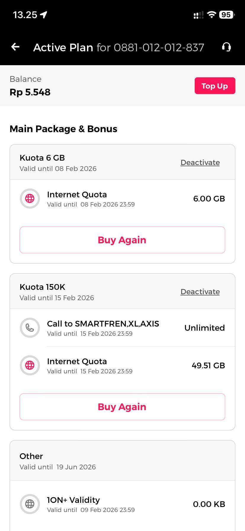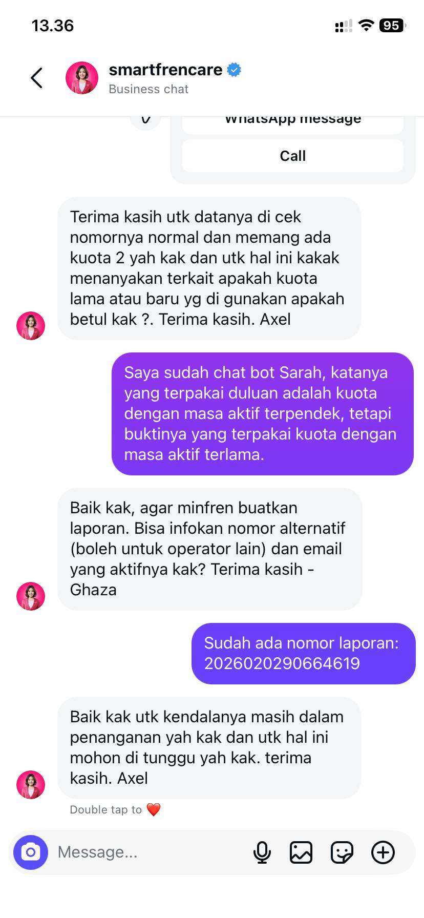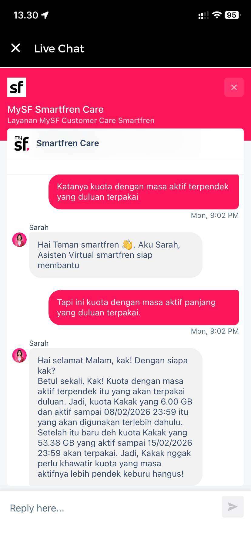 Awalnya, saya menggunakan Smartfren untuk internet, dengan kuota utama 150 GB seharga 150 ribu selama sebulan. Kemudian, saya tertarik untuk menambah kuota internet dengan membeli dua kali di hari yang berbeda. Sebelum itu, saya bertanya kepada bot chat Sarah di aplikasi MySmartfren tentang kuota mana yang akan terpakai terlebih dahulu jika saya membeli paket data tambahan. Bot tersebut menjawab bahwa kuota dengan masa aktif terpendek akan terpakai lebih dulu. Sayangnya saya tidak sempat mengambil screenshot dari percakapan tersebut.