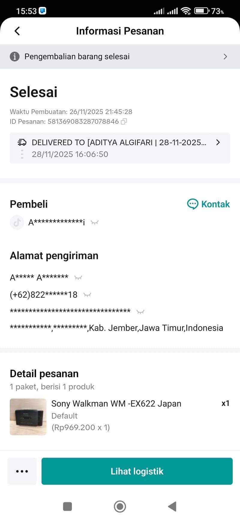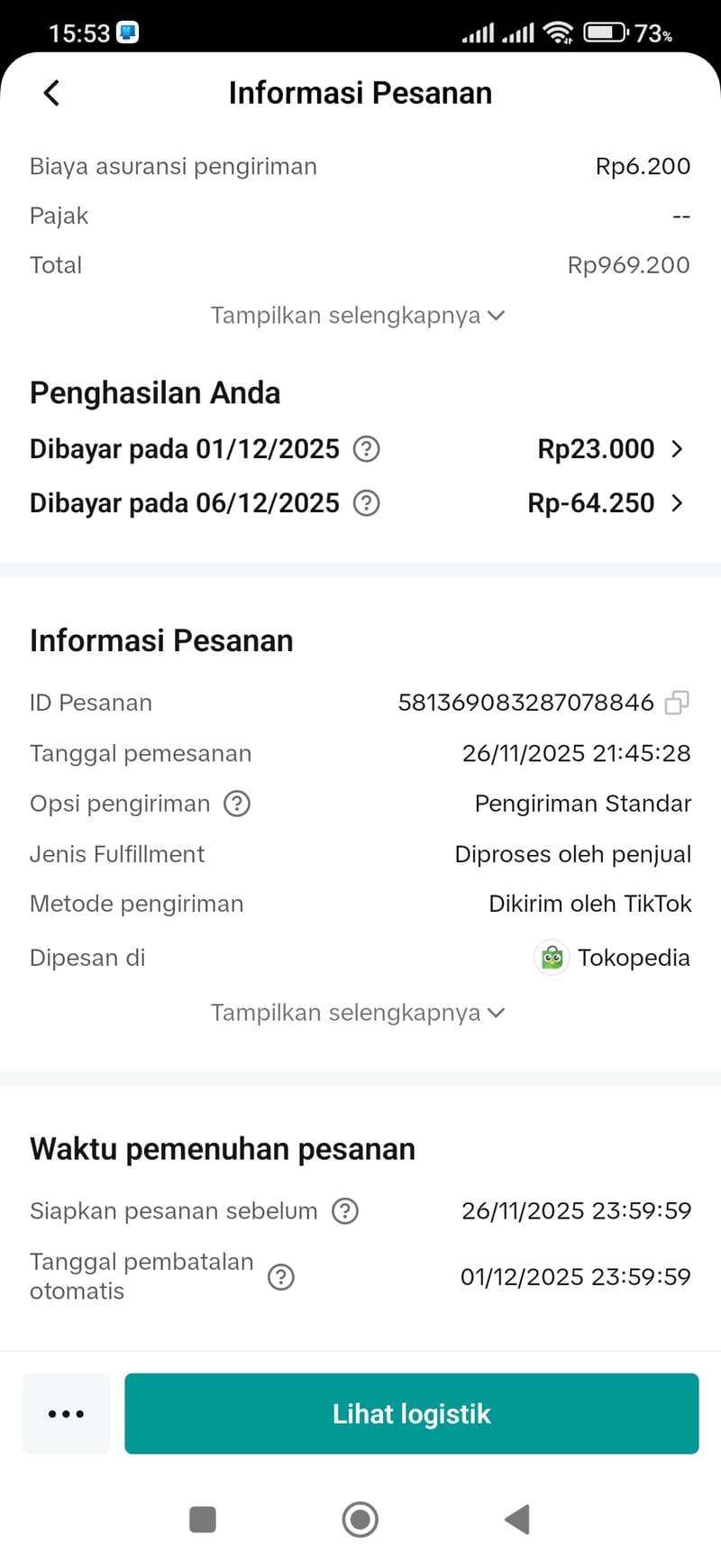 Awalnya saya berpikir positif karena ada poin nomor 5 mengenai asuransi. Mungkin ini adalah kebijakan Tokopedia karena barang yang rusak kemudian dikomplain oleh pembeli, saya juga berpikir karena produknya memiliki asuransi. Namun ketika kompensasi asuransi dibayarkan pada tanggal 30 November 2025 sebesar Rp23.000, saya yakin ini adalah kesalahan sistem Tokopedia.