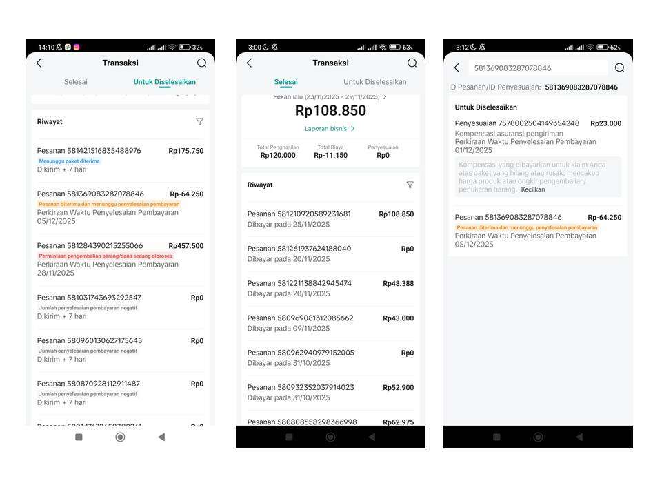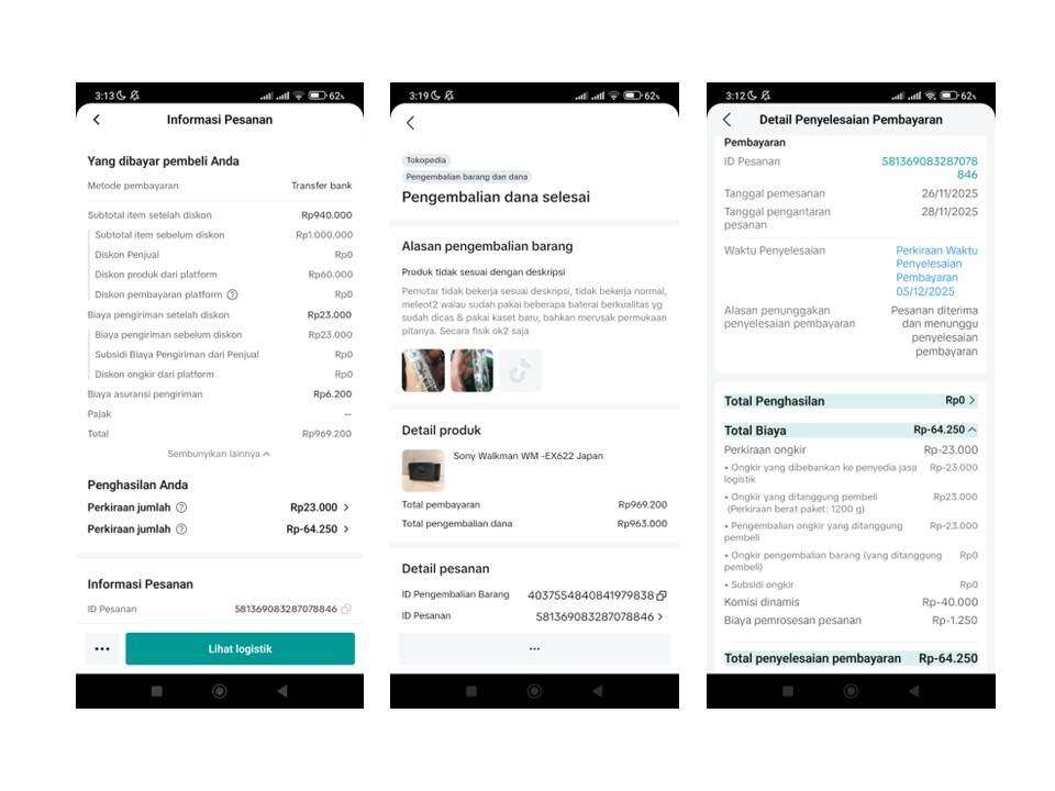 Poin 3 hingga 5 dilakukan secara otomatis oleh sistem Tokopedia secara berurutan, tanpa memerlukan persetujuan dari seller. Anehnya, potongan transaksi tetap berjalan, dan asuransi juga otomatis cair meskipun pembeli belum menyelesaikan transaksi, yang selesai secara otomatis pada tanggal 5 Desember 2025.