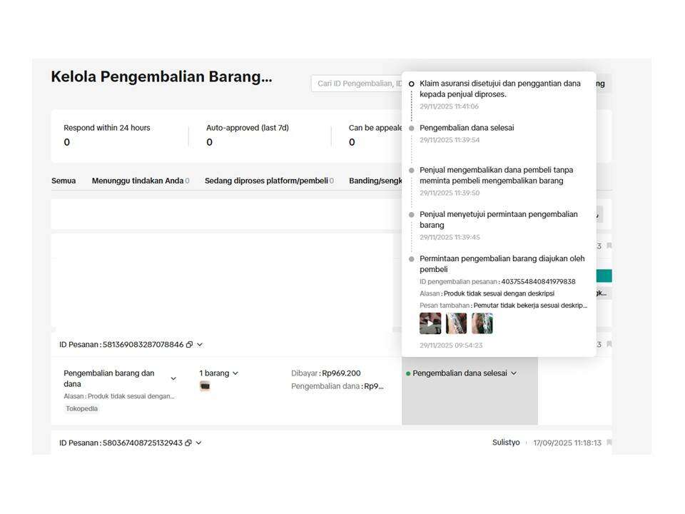 - Klaim asuransi disetujui dan penggantian dana kepada penjual sedang diproses pada tanggal 29/11/2025 11:41:06.