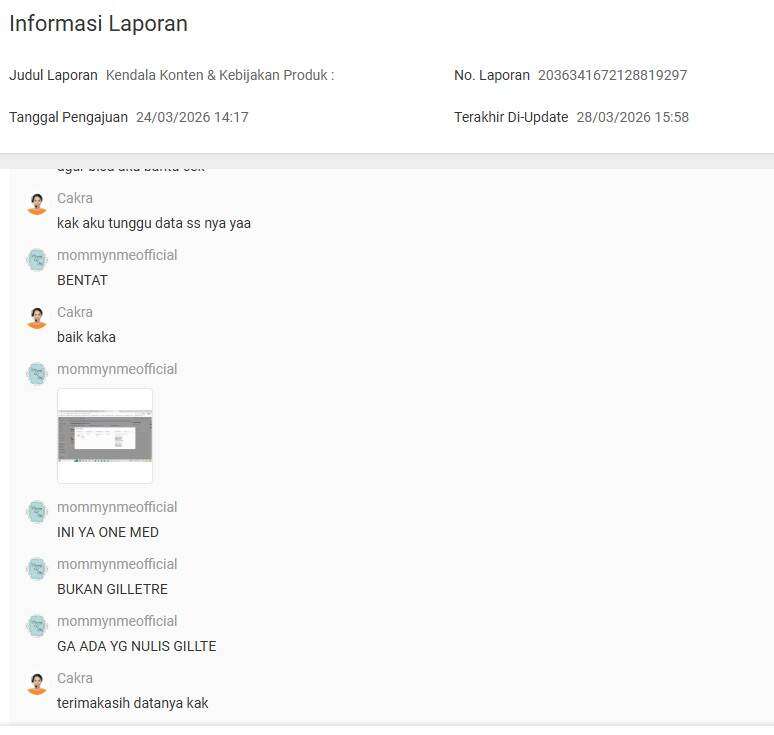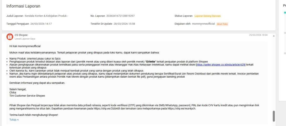 Saya juga menyampaikan keberatan atas tindakan pelaporan dari pihak Gillette yang dilakukan tanpa peninjauan yang cermat terhadap produk yang saya jual. Produk tersebut tidak menggunakan merek, logo, maupun atribut milik Gillette, sehingga laporan tersebut patut dipertanyakan.