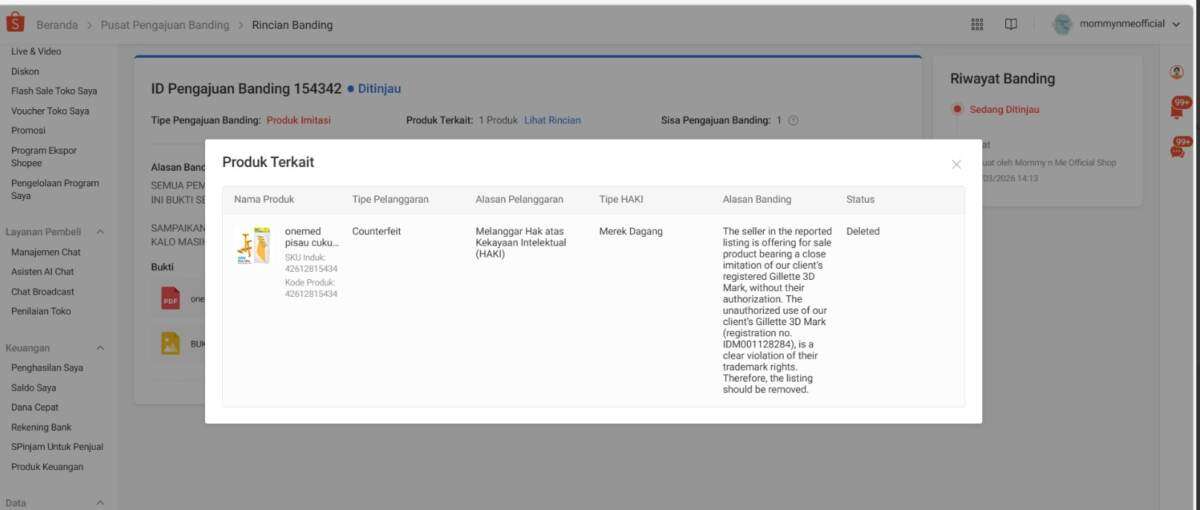 Saya adalah penjual aktif di platform Shopee dengan username mommynmeofficial, melalui surat ini, saya menyampaikan keberatan atas penolakan banding yang saya ajukan, yang dilakukan tanpa disertai penjelasan yang jelas dan rinci.
