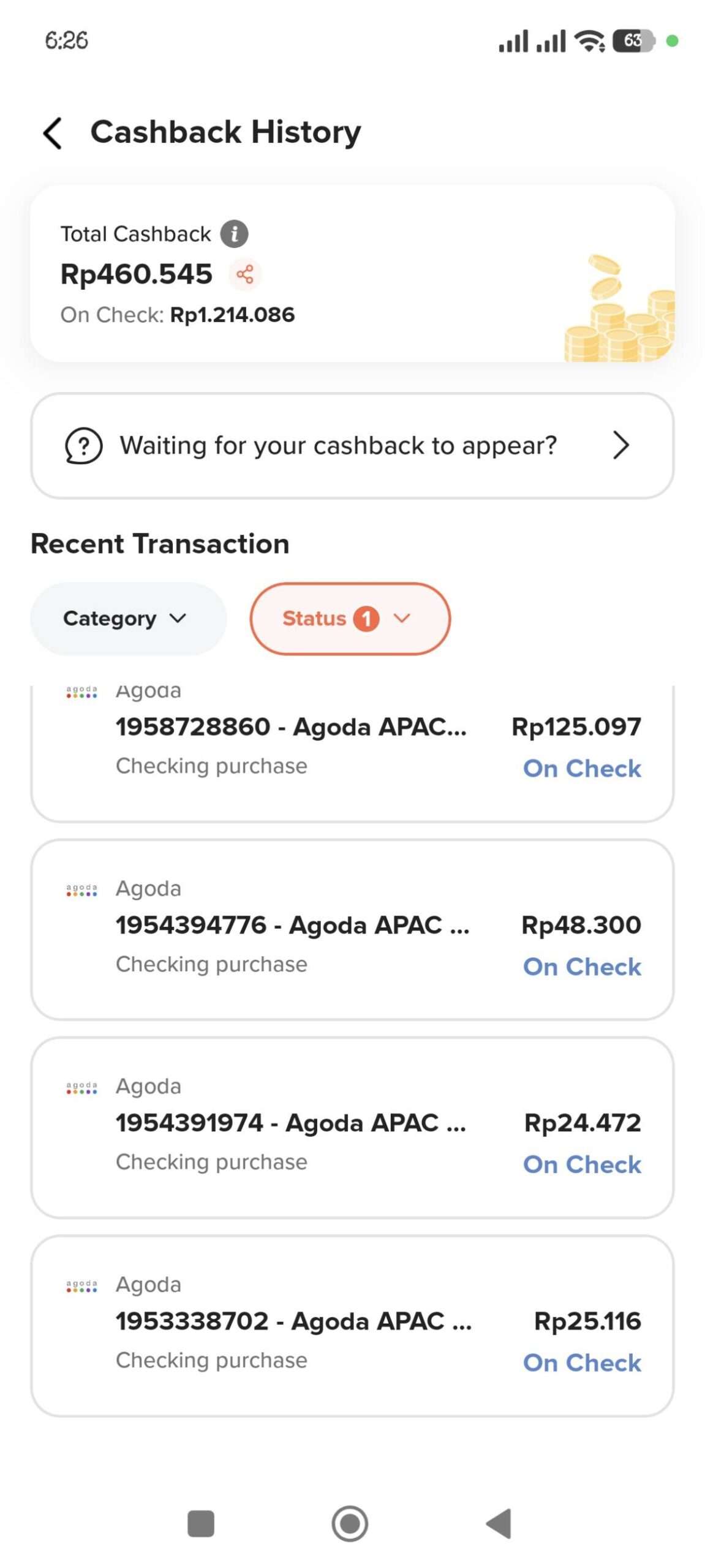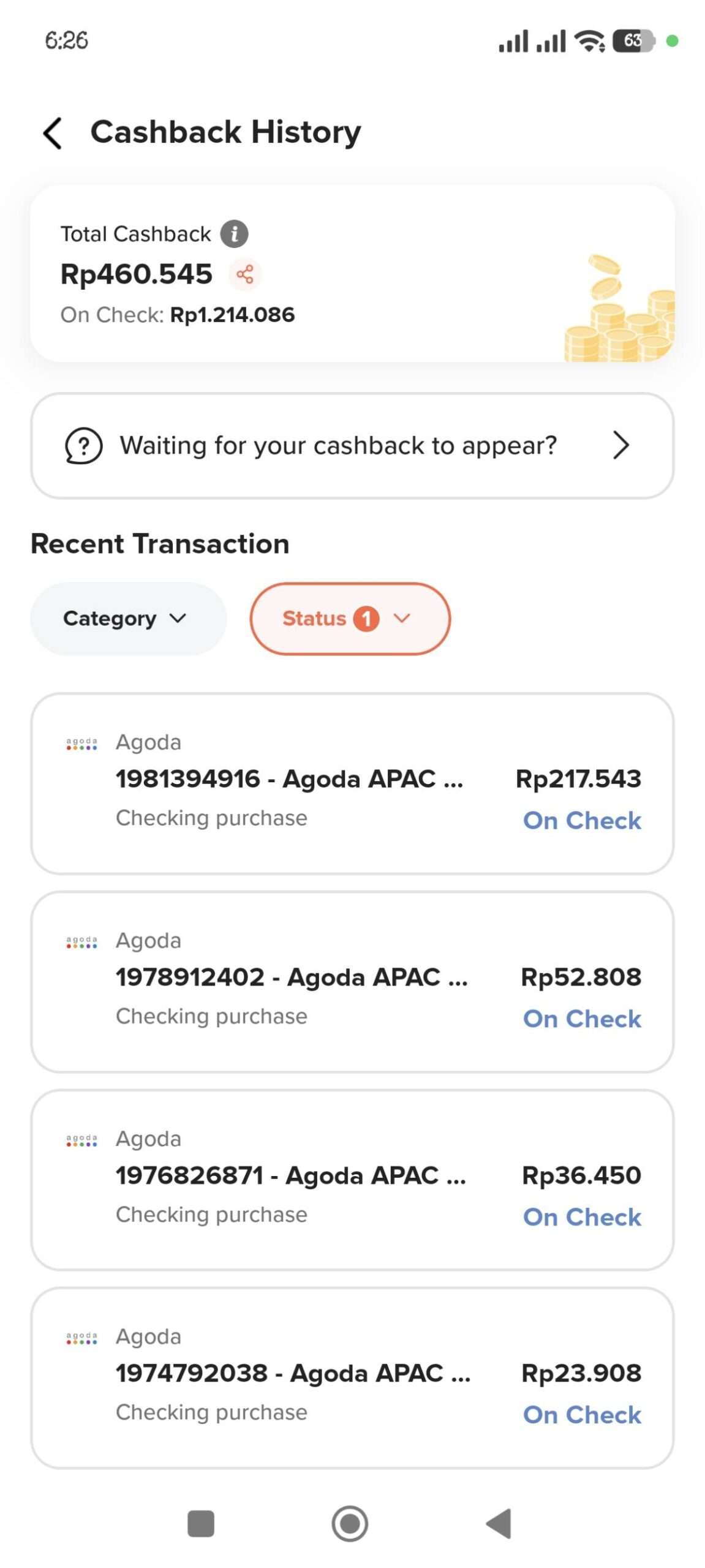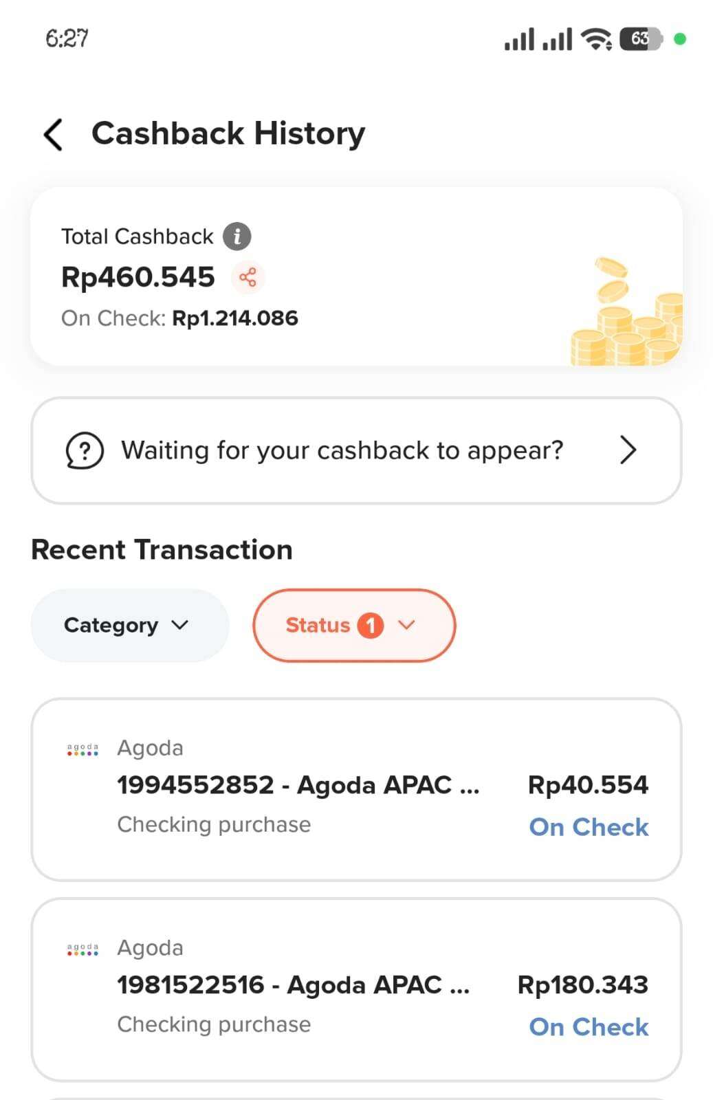 Kedua transaksi Agoda tersebut hanyalah sebagian dari transaksi yang saya lakukan. Masih ada 11 transaksi cashback lainnya, termasuk 2 transaksi dari Klook, yang sampai sekarang statusnya masih On Check.