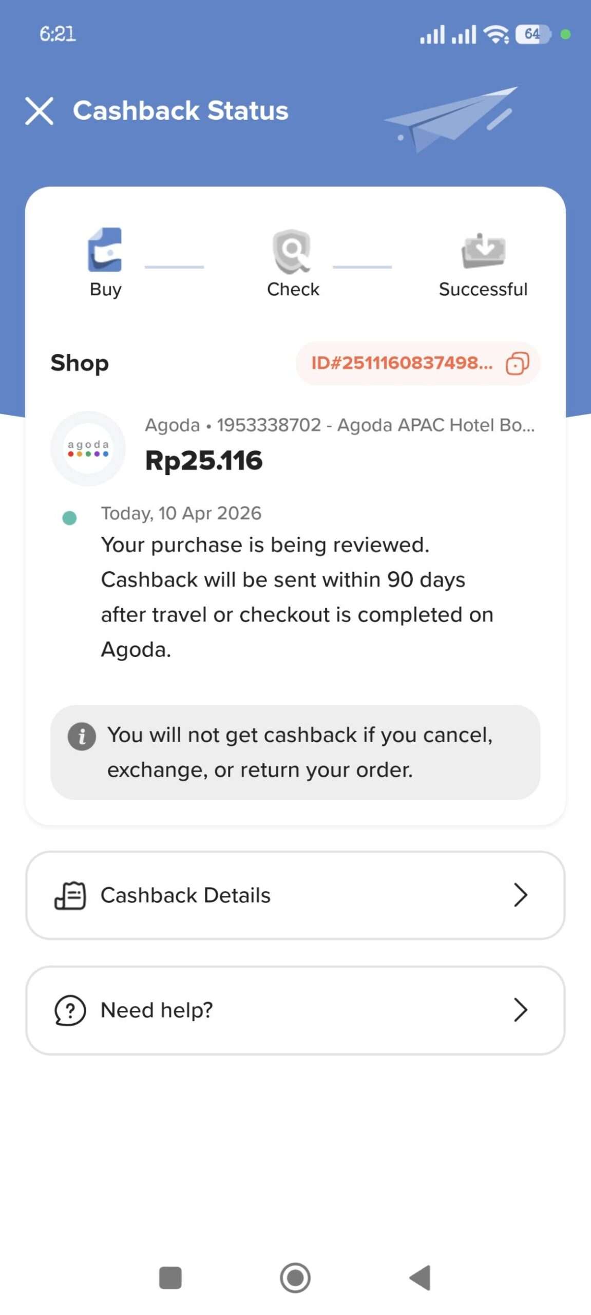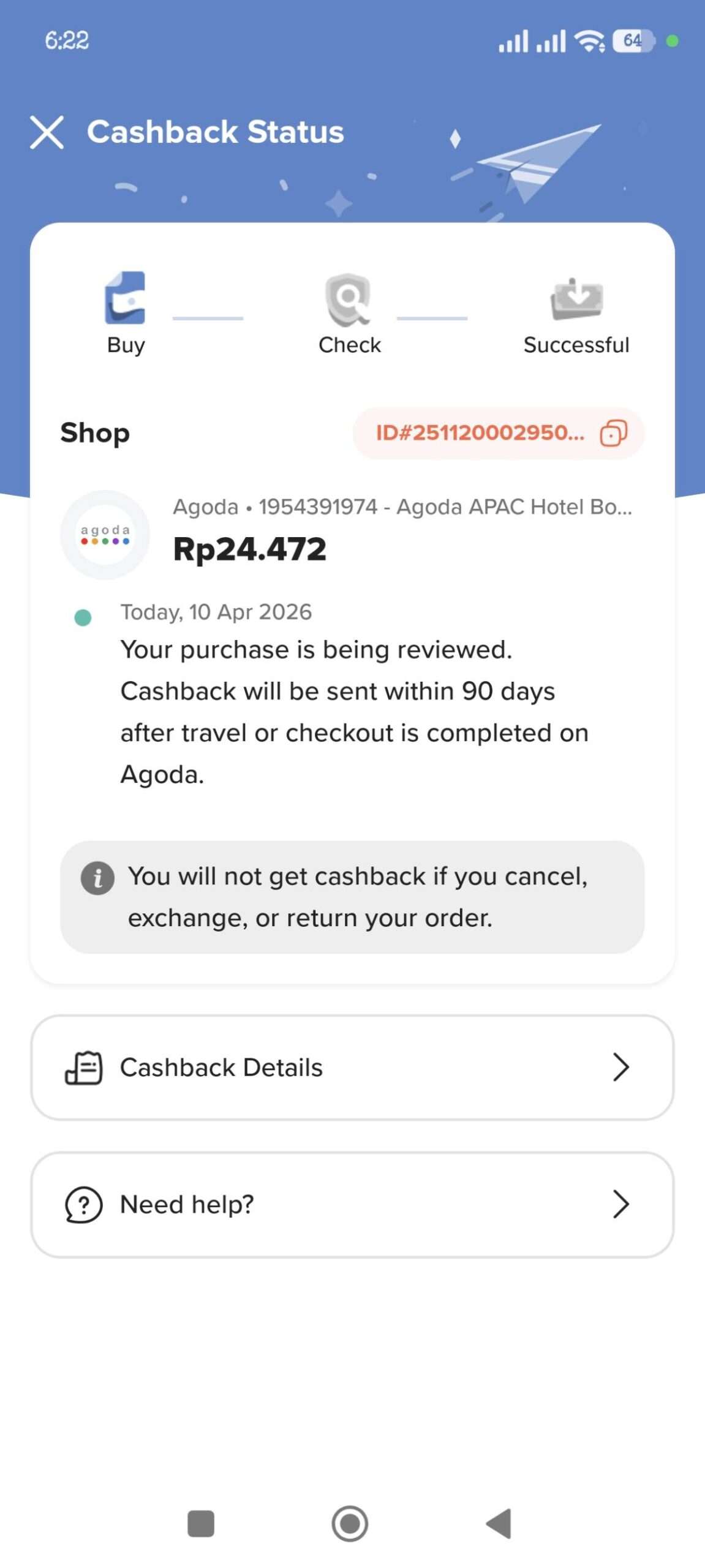 Cashback dari Agoda tersebut berasal dari transaksi yang dijanjikan masuk 90 hari kerja setelah check-out, yaitu: