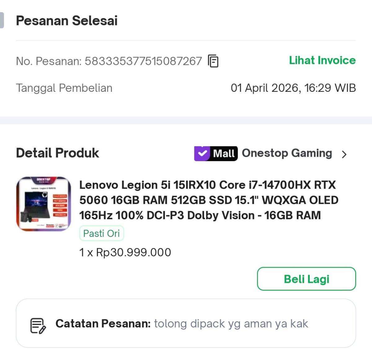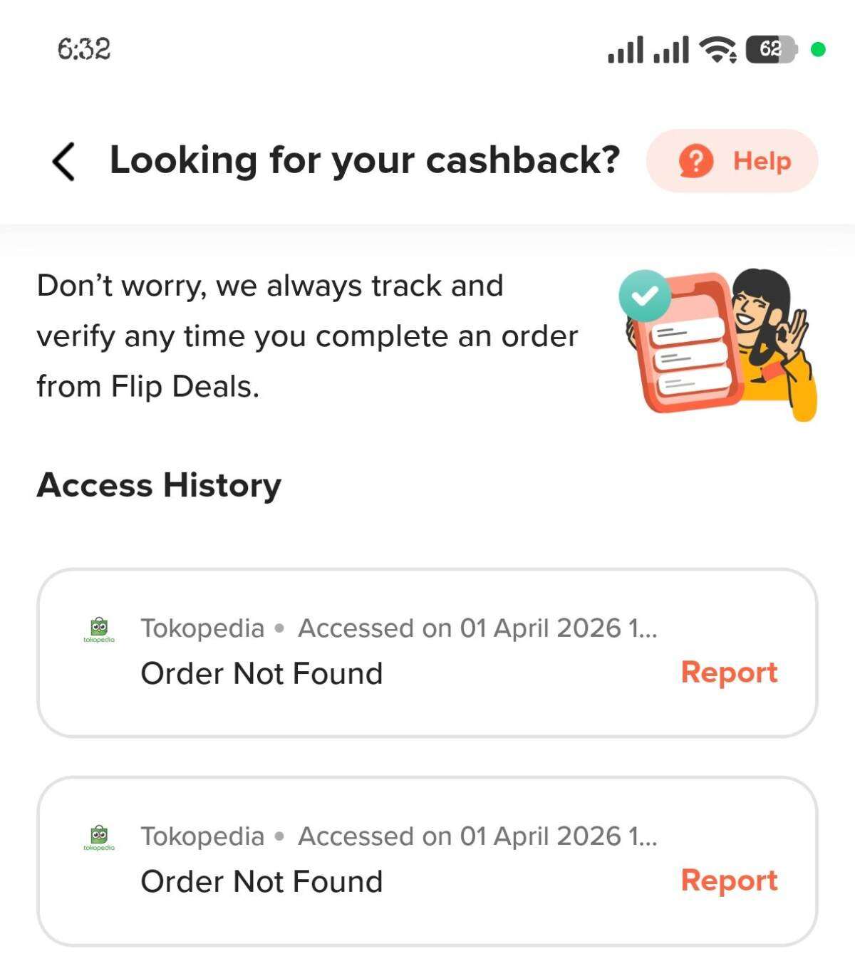 Demikian pula dengan cashback dari Tokopedia untuk belanja yang dilakukan pada 1 April 2026—statusnya Order Not Found, padahal semua transaksi dari Tokopedia yang dilakukan setelah tanggal tersebut dilakukan dengan langkah yang sama dan cashback-nya masuk dengan status On Check.