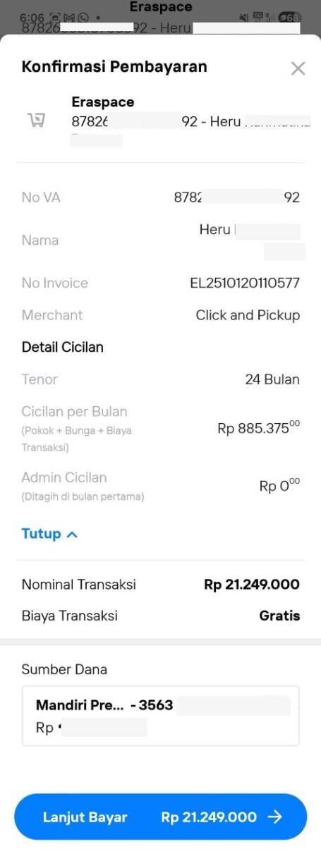- Saya melakukan pembayaran menggunakan metode kartu kredit dan memilih tenor 24 bulan.