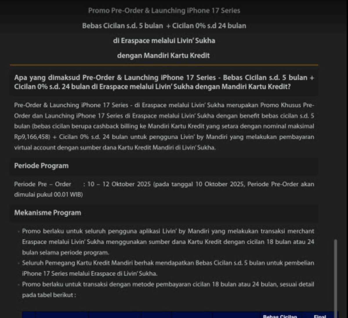Bank Mandiri meluncurkan program pre-order iPhone 17 Series melalui aplikasi Livin (Sukha) pada periode promosi 10-12 Oktober 2025, dengan syarat pembayaran menggunakan kartu kredit Bank Mandiri dalam skema cicilan. Pemesan akan mendapatkan cashback cicilan hingga 5x cicilan.