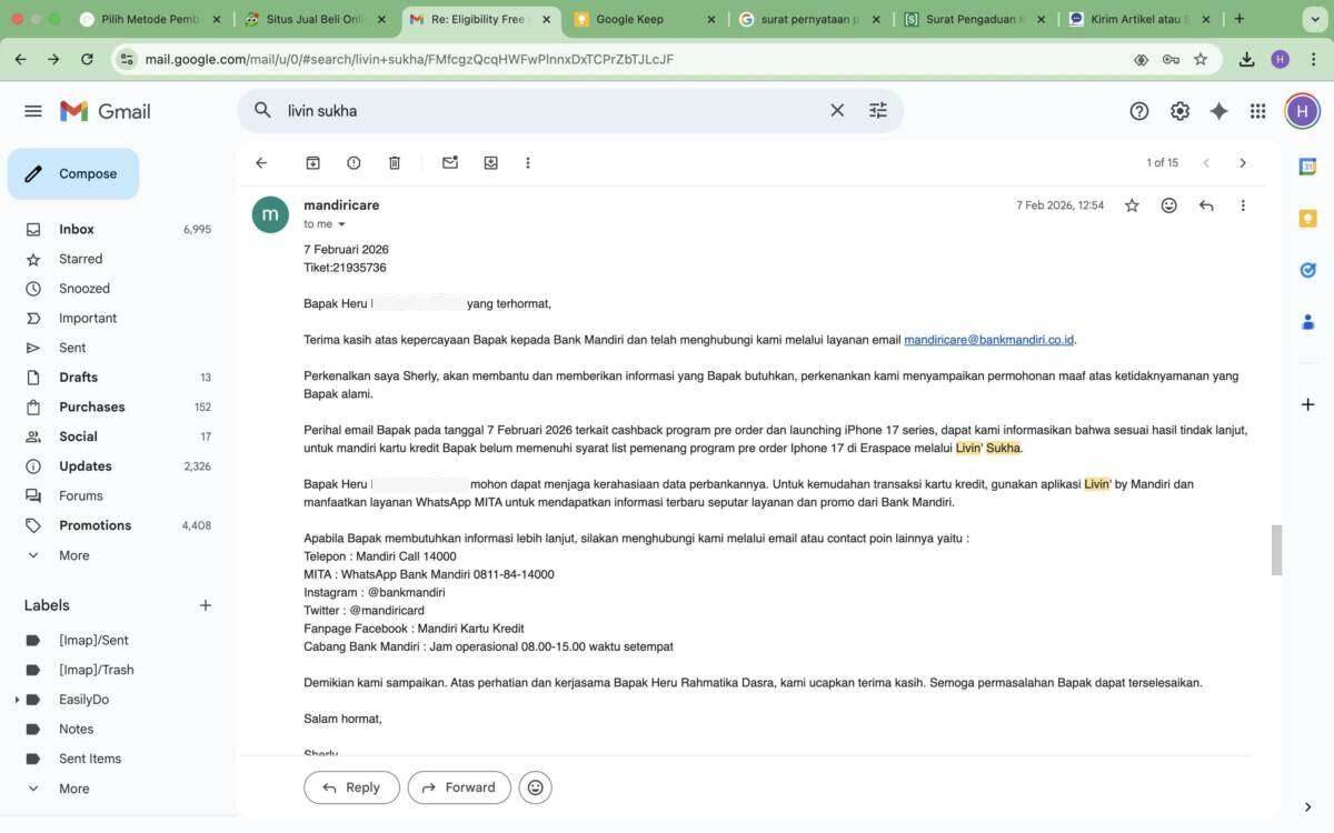 - 06 Februari 2026: Saya mengirim email ke mandiricare dengan nomor tiket 21935736, yang dijawab pada tanggal 07 Februari 2026 dengan informasi: “Perihal email Bapak pada tanggal 7 Februari 2026 terkait cashback program pre order dan launching iPhone 17 series, dapat kami informasikan bahwa sesuai hasil tindak lanjut, untuk mandiri kartu kredit Bapak belum memenuhi syarat list pemenang program pre order iPhone 17 di Eraspace melalui Livin’ Sukha.“