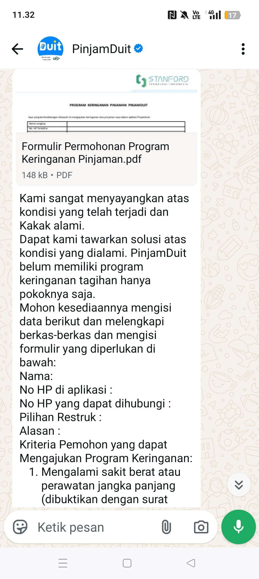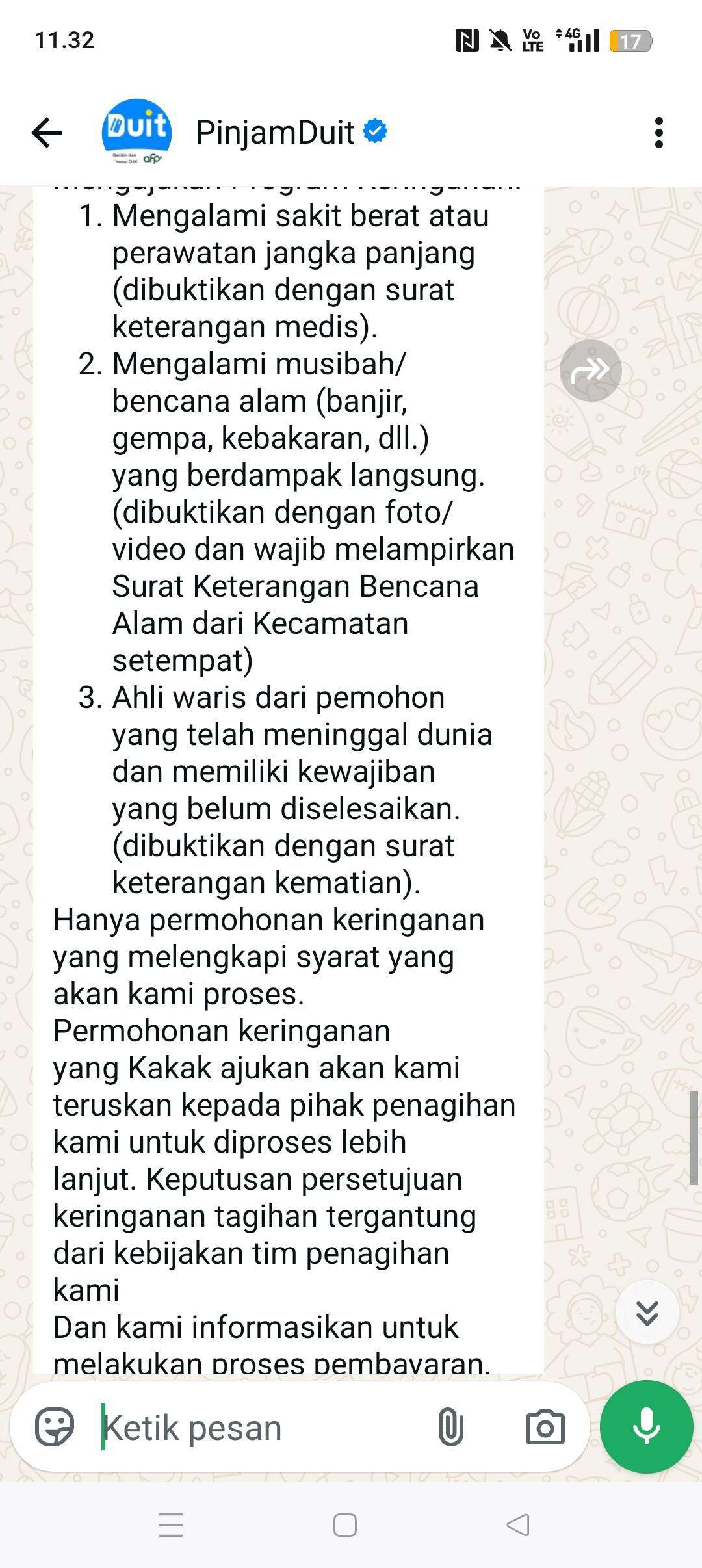 Jadi, pada saat jatuh tempo yang kedua pada tanggal 7 Maret 2026, saya mengajukan keringanan, tetapi pihak customer service PinjamDuit mempersulit dengan berbagai syarat. Saya hanya bisa mengajukan keringanan jika mengalami sakit berat, meninggal, atau terkena musibah. Pihak PinjamDuit sama sekali tidak mau membantu nasabah. Apakah begini perilaku pindar yang berlogo OJK?