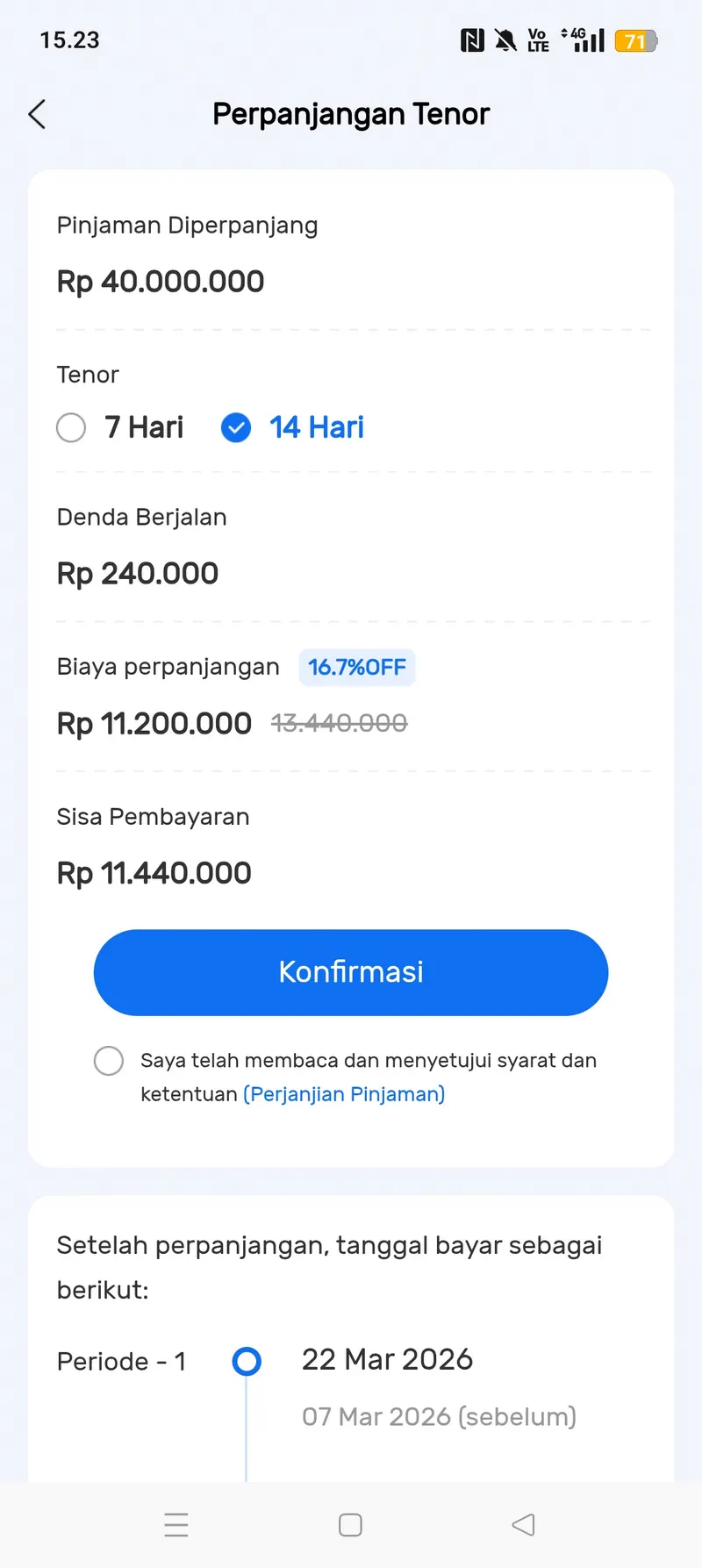 Saya sudah melakukan perpanjangan sekali sebelum pengajuan karena takut dikenakan denda. Namun, pihak customer service PinjamDuit mengatakan bahwa saya tidak bisa meminta keringanan sebelum jatuh tempo.