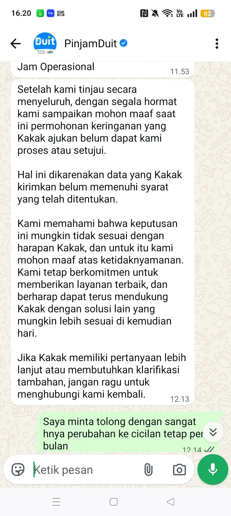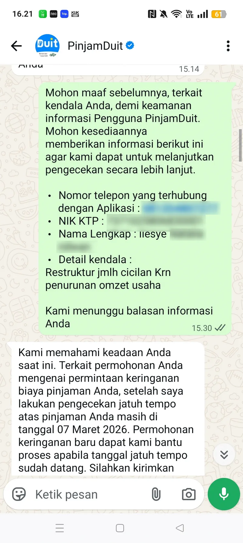 Melalui Media Konsumen ini, saya ingin menyampaikan kekecewaan saya terhadap aplikasi PinjamDuit yang mempersulit niat baik saya untuk tetap melunasi pinjaman meskipun omzet usaha saya sedang menurun. Sebelumnya saya selalu membayar tepat waktu. Namun karena usaha saya mengalami penurunan, saya ingin mengajukan perubahan cicilan menjadi cicilan tetap per bulan.