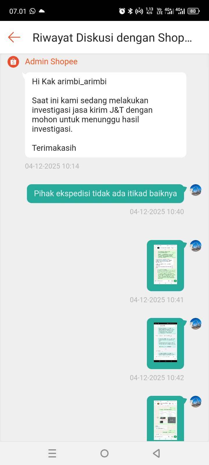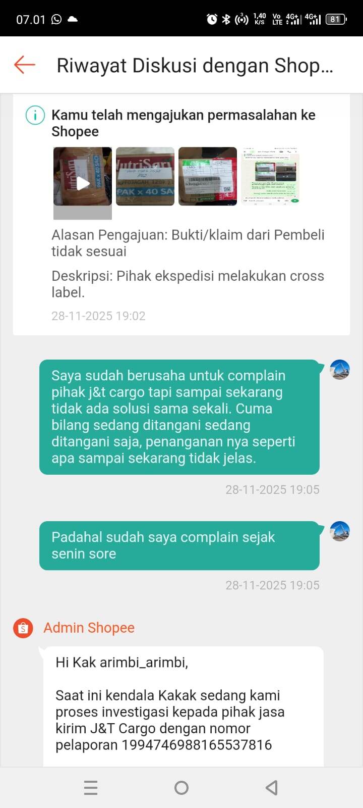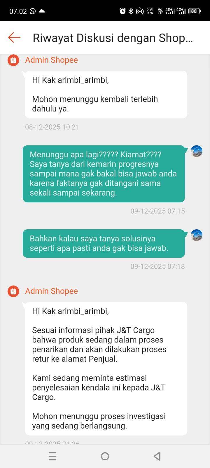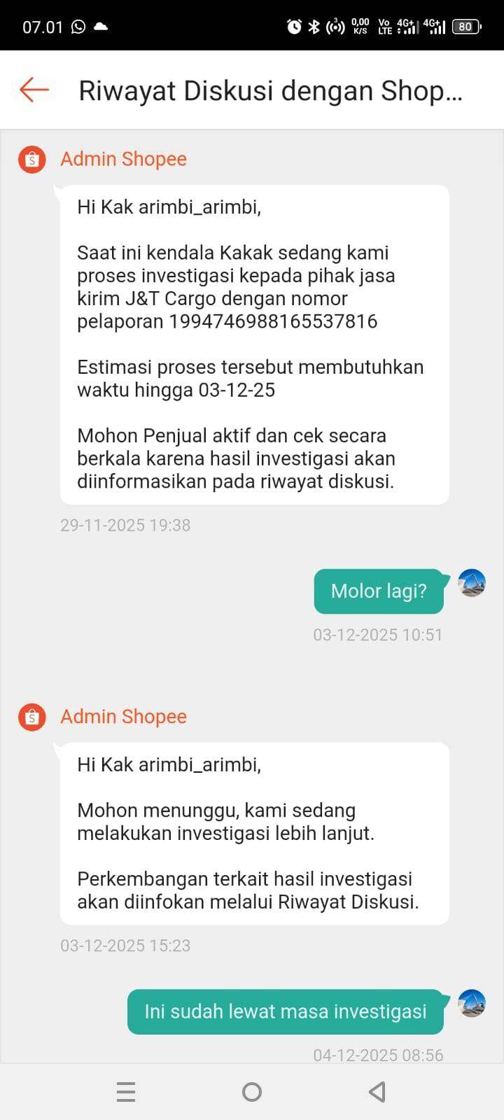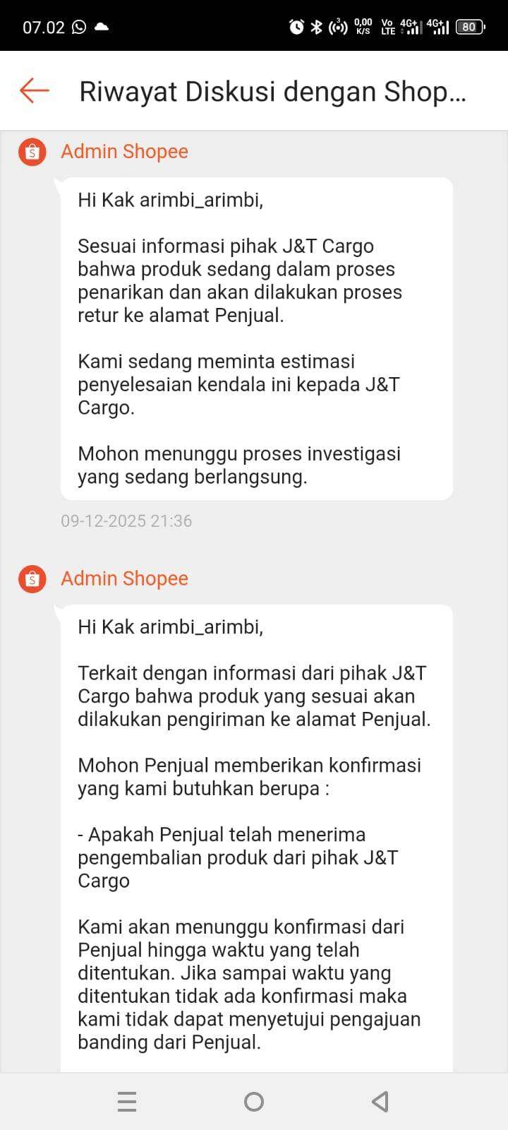 Baru pada tanggal 9 Desember 2025, saya mendapat informasi bahwa paket milik pembeli Probolinggo telah diambil kembali oleh pihak J&T Cargo. Informasi ini juga dikonfirmasi langsung oleh pembeli kepada saya. Anehnya, hingga tanggal 19 Desember 2025, paket tersebut belum juga sampai ke saya. Hingga kini tidak jelas keberadaan paket tersebut, sementara pembeli Probolinggo tetap menagih barang yang telah dibayarkan.