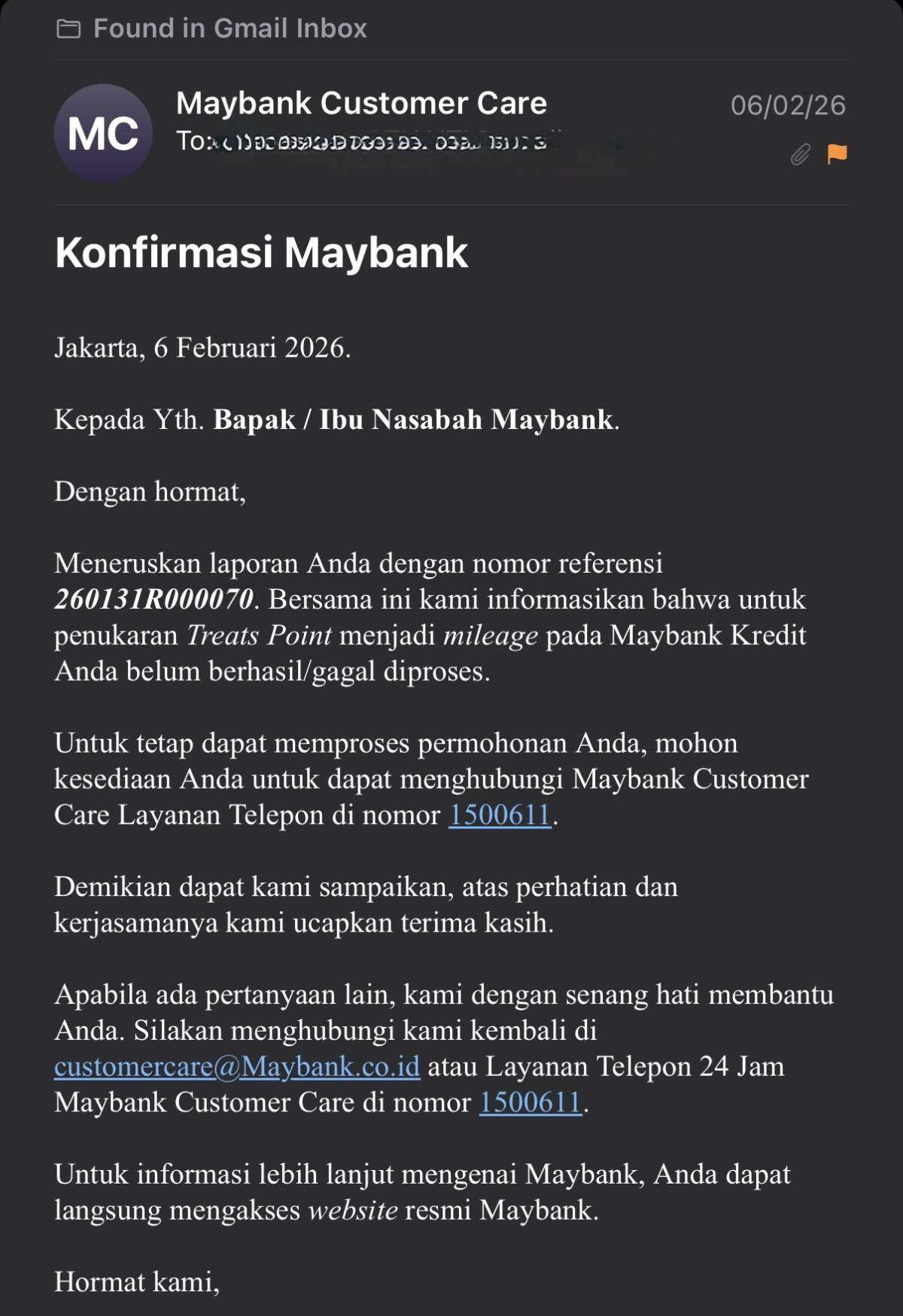 Saya juga menanyakan apakah ada kendala dalam penukaran, karena saya menghubungi untuk penukaran pada 31 Januari 2026, yang merupakan hari terakhir sebelum expired Maybank TREATS Points saya pada 1 Februari 2026, dan CS Maybank mengonfirmasi tidak ada kendala.