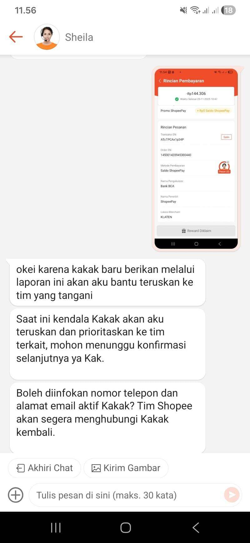 Kemudian, saya menghubungi CS ShopeePay melalui fitur Bantuan di aplikasi ShopeePay. Proses ini ditangani oleh salah satu CS (saya lupa namanya) yang meminta data-data seperti bukti transaksi, alamat email, dan lain-lain. Saya diinformasikan bahwa saya akan dihubungi oleh tim terkait dalam waktu 1×24 jam melalui email. Namun, tidak ada email atau telepon yang masuk dari tim ShopeePay.