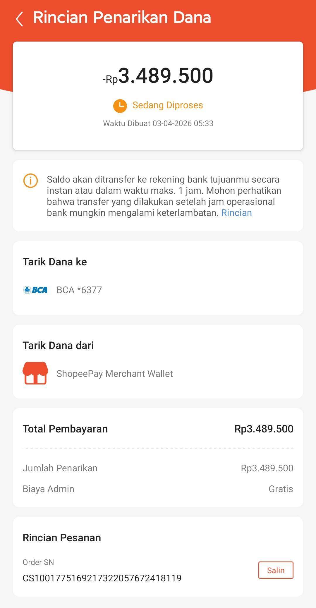 Namun, sampai surat ini saya buat pada tanggal 4 April 2026, dana tersebut belum juga masuk ke rekening saya. Di aplikasi, status transaksi masih tertahan dengan keterangan “Diproses”.
