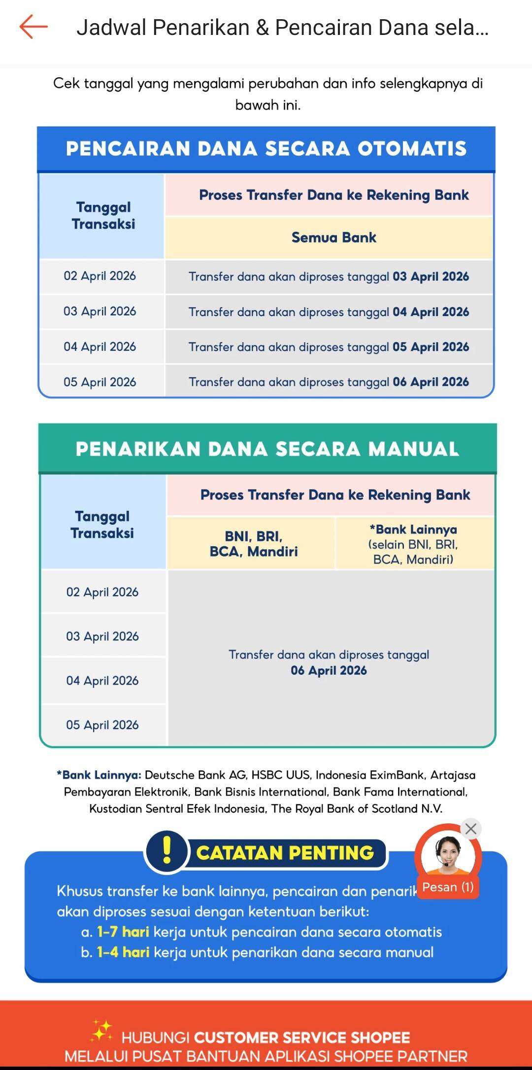 Berdasarkan tabel jadwal pencairan resmi dari Shopee, transaksi yang masuk pada tanggal 2 April 2026 seharusnya cair secara otomatis ke rekening bank saya (BCA) pada tanggal 3 April 2026. Transaksi dilakukan secara offline menggunakan QRIS atas nama saya sebagai owner.