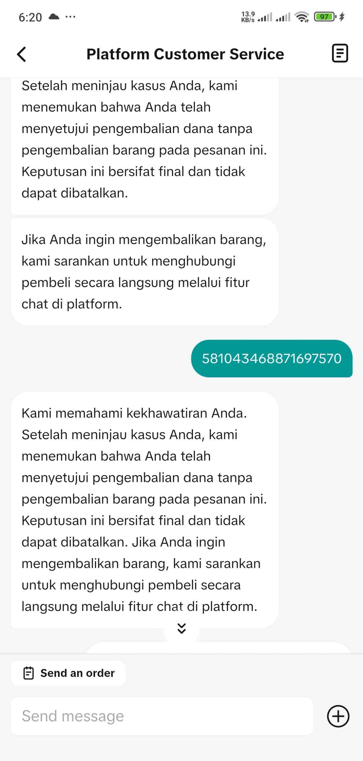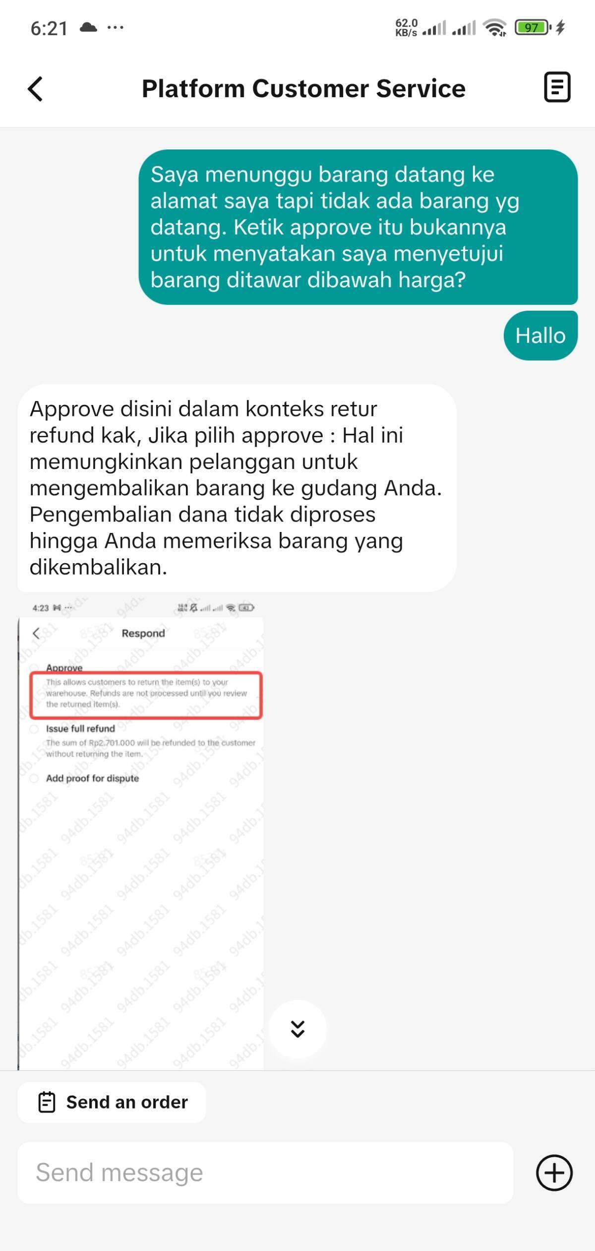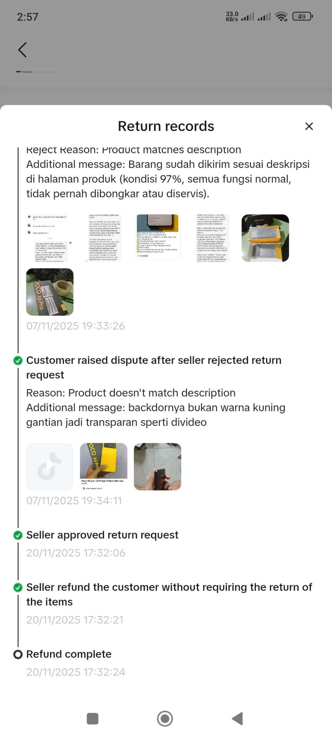 “Penjual sudah menyetujui pengembalian dana tanpa retur.”