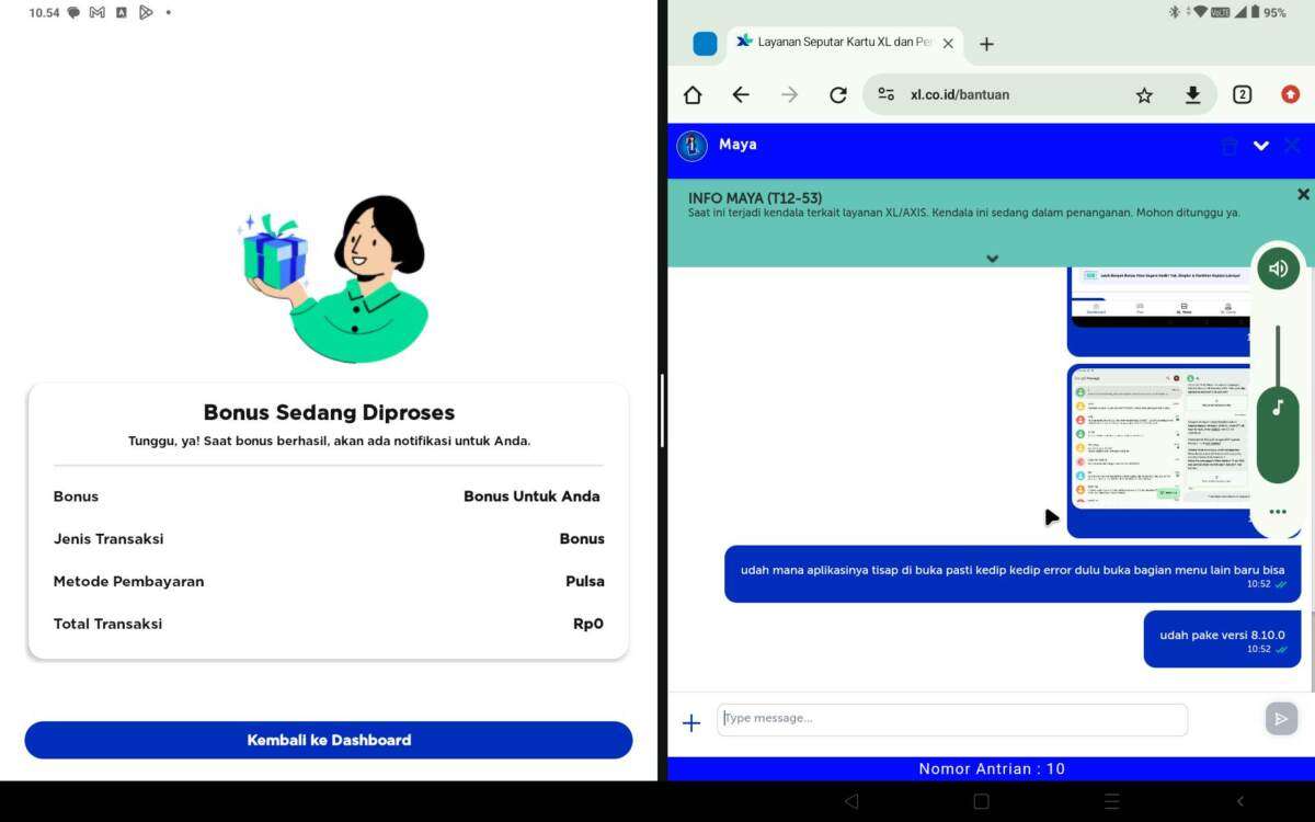 Namun, saya menunggu selama 10 menit tapi masih belum terhubung juga. Selama menunggu, saya kembali memeriksa menu bonus untuk melihat apakah sudah ada. Pada pukul 10:54, akhirnya menu bonus muncul. Saya berhasil mengklaim bonus tersebut.
