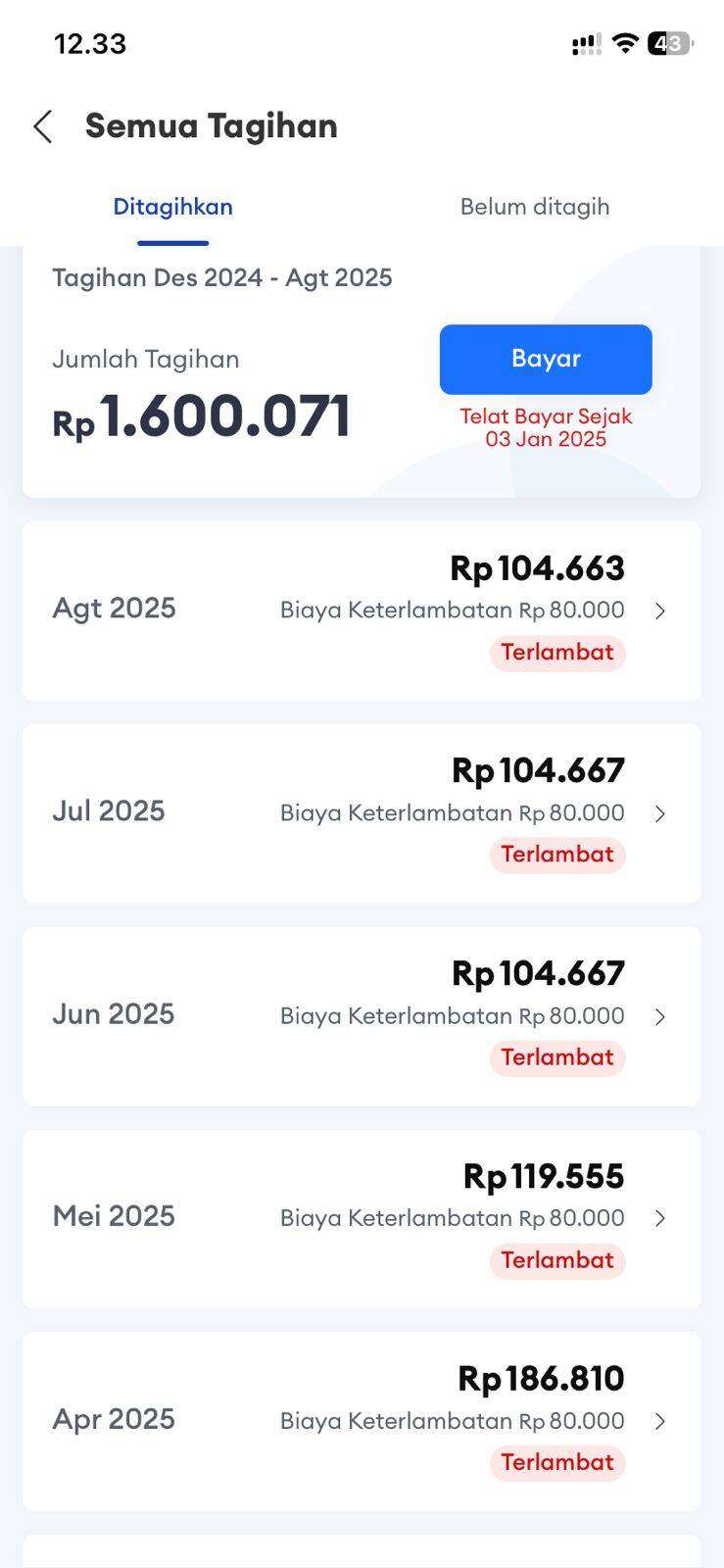 Pokok tagihan saya sesungguhnya hanya sekitar Rp600.000–Rp700.000 (total penggunaan PayLater). Namun karena terdapat 9 cicilan yang terlambat, denda yang dikenakan mencapai Rp900.000, sehingga total yang harus saya bayar menjadi Rp1.600.000. Sebagian sudah saya cicil sedikit demi sedikit, sehingga sisa tagihan saat ini diperkirakan sekitar Rp1.400.000.