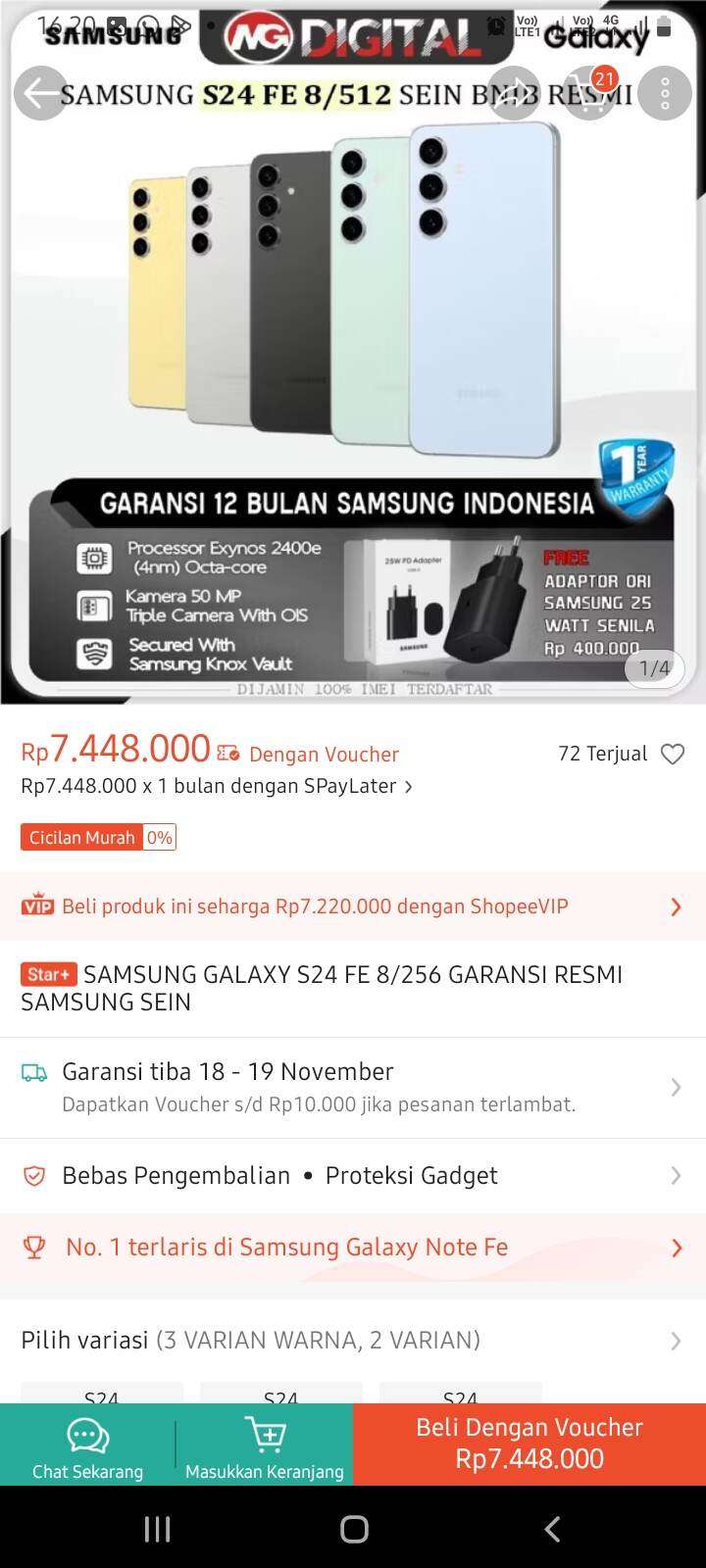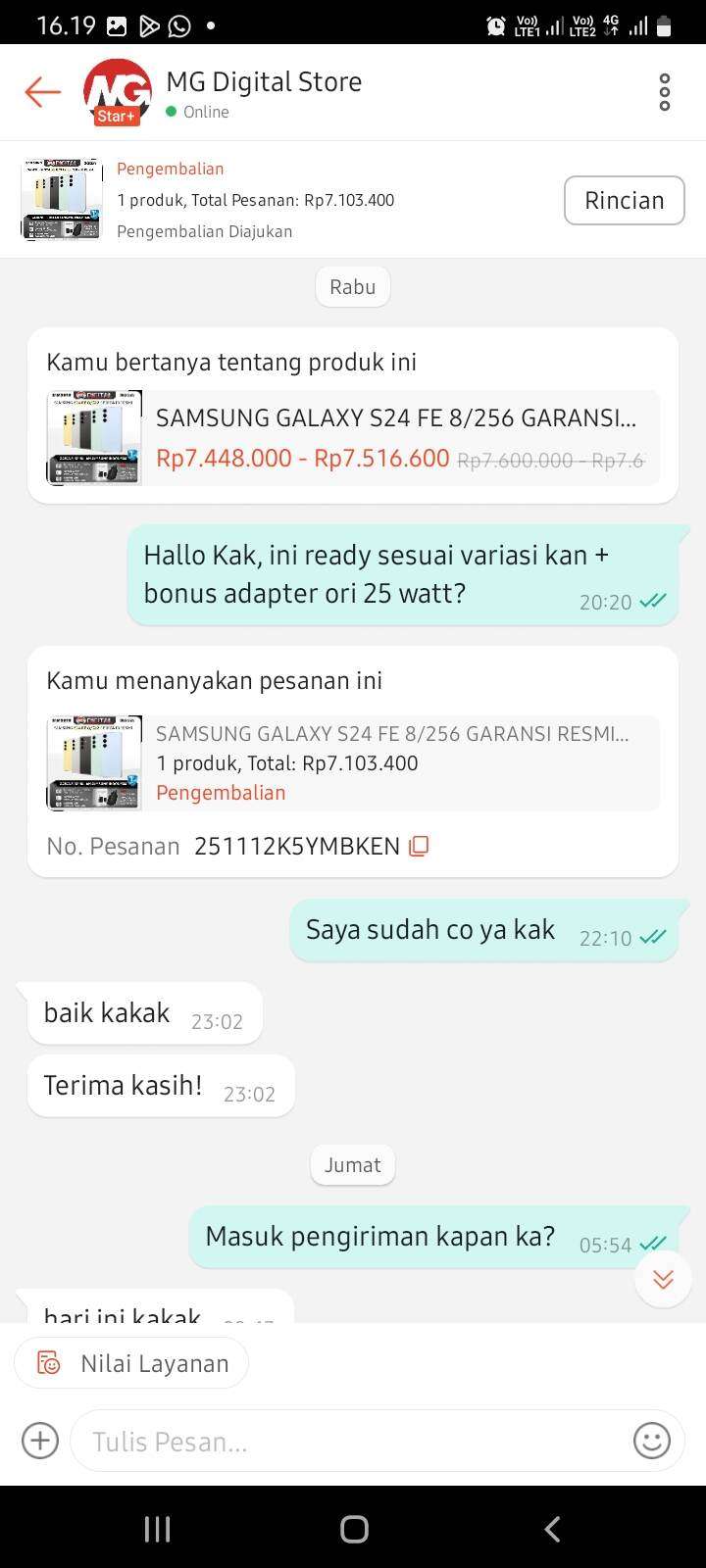 Selamat sore. Hari ini, Minggu, 16 November, saya menerima paket Samsung S24 FE dari seller Shopee bernama MG Digital Store dengan nomor pengembalian 2511160VKQE10Y2, yang mana berisi tisu basah Paseo dan sampah tisu kering beserta boks parfum Morabito.