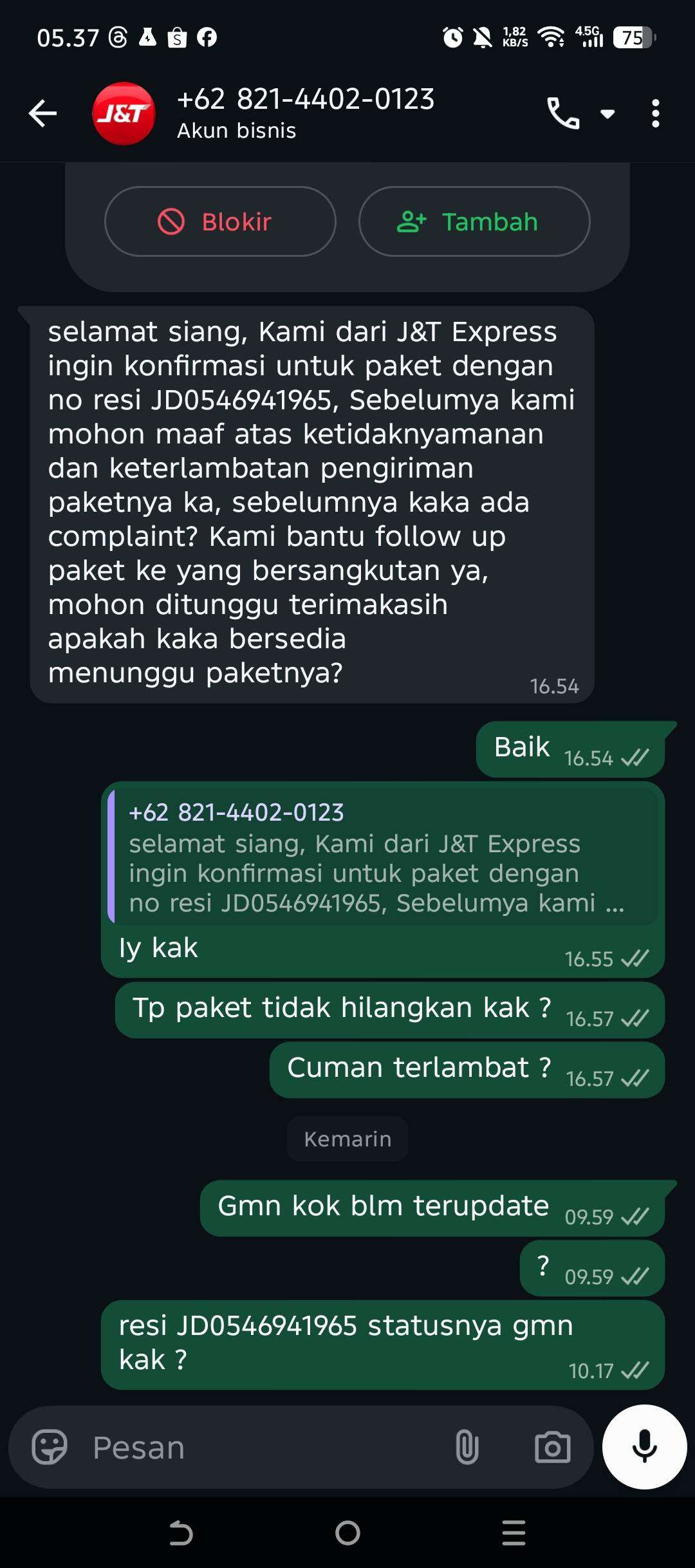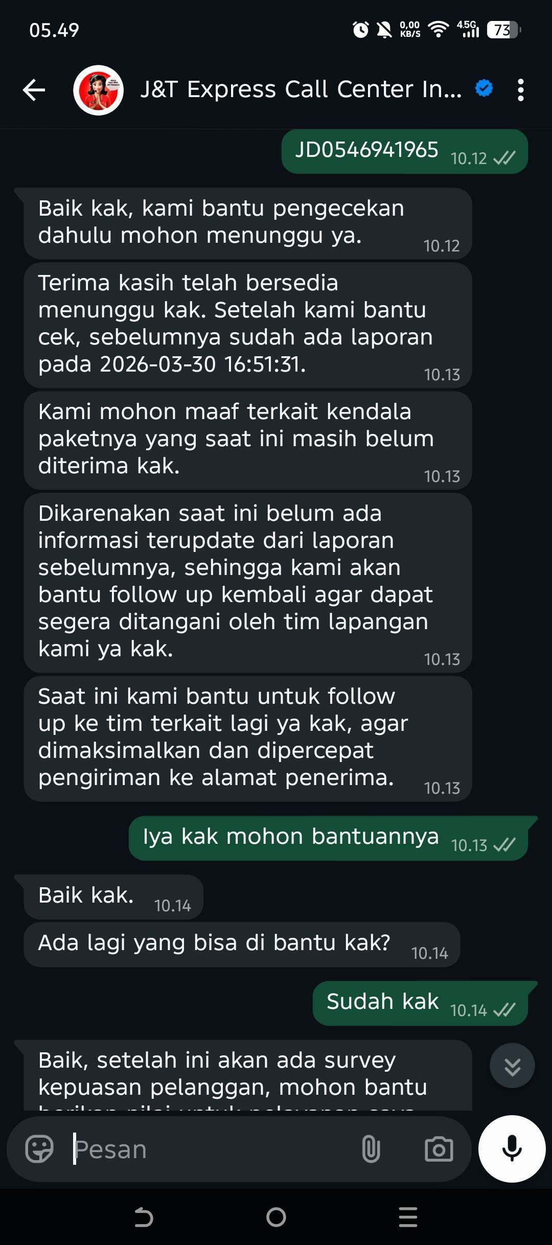 Saya sudah komplain ke call center J&T Express, tetapi hanya diteruskan ke agen. Pihak agen hanya menghubungi saya di awal tanpa ada follow-up sama sekali.