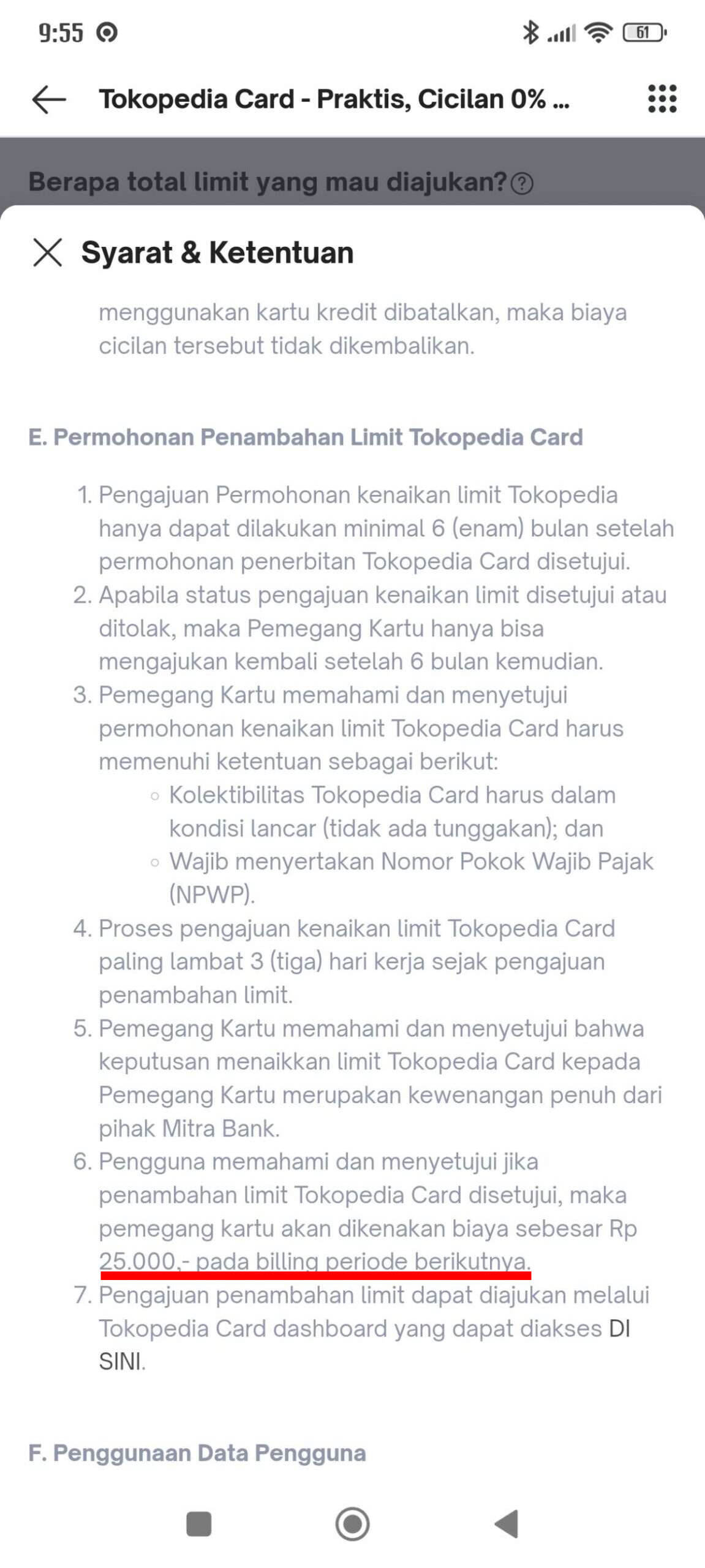 Sebelumnya saya memang pernah mengajukan kenaikan limit kartu kredit BRI saya. Saya juga sudah menyetujui semua syarat dan ketentuan, termasuk ada biaya kenaikan limit sebesar Rp25.000.