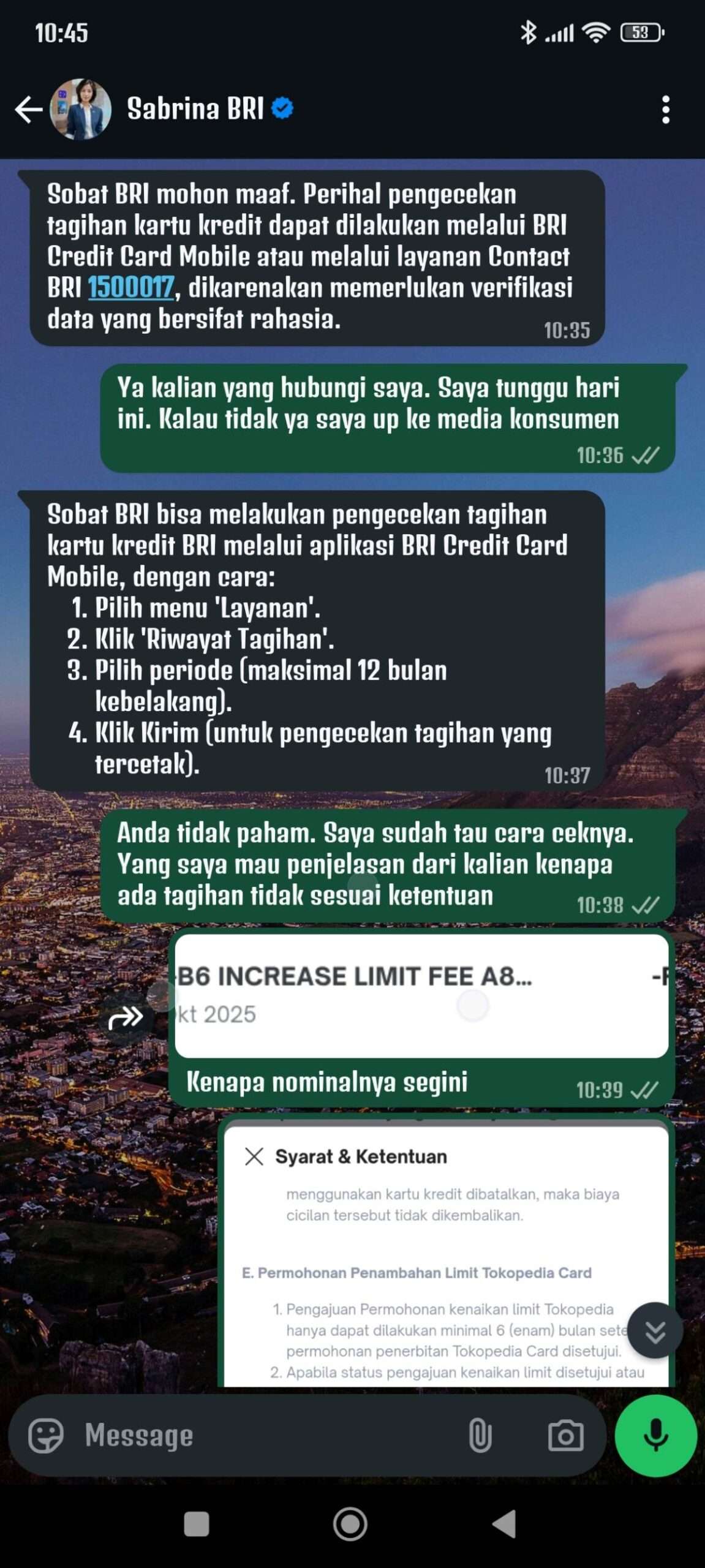 Saya coba konfirmasi ke pihak BRI melalui layanan WhatsApp dan saya ingin mereka yang menghubungi saya karena tagihan ini sudah tidak sesuai dengan ketentuan dan tidak ada pemberitahuan kepada saya mengenai hal tersebut. Namun mereka tetap mengarahkan saya untuk menghubungi layanan telepon.