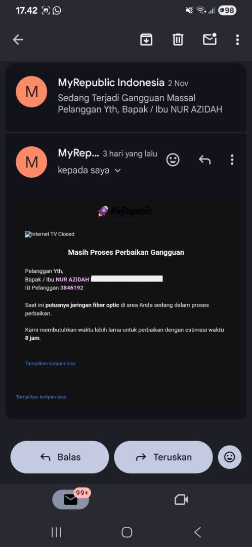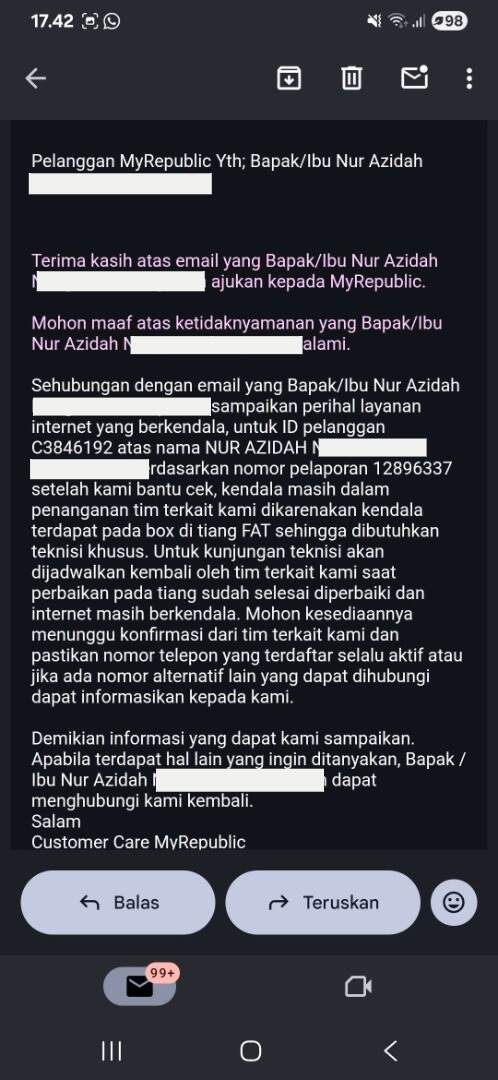 Saya mengerti bahwa gangguan teknis bisa terjadi kapan saja. Namun, yang membuat pelanggan kecewa bukan hanya masalah gangguan itu sendiri, tetapi juga bagaimana pihak penyedia layanan menangani dan berkomunikasi dengan pelanggannya. Dalam hal ini, MyRepublic sangat perlu meningkatkan kecepatan respons dan transparansi informasi ketika menghadapi kendala seperti ini.