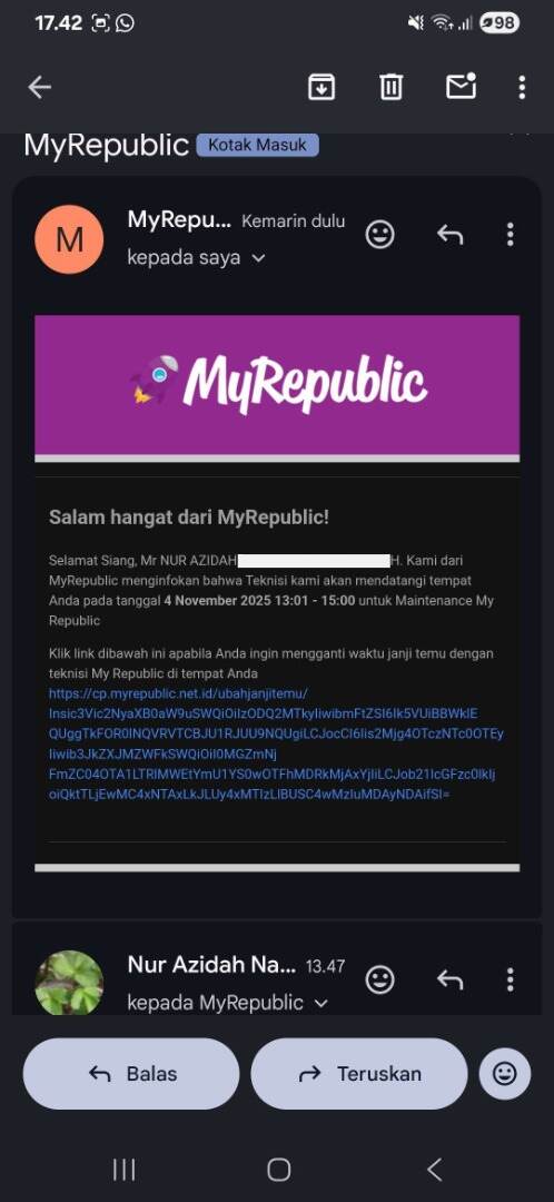 Semoga pengalaman ini bisa menjadi masukan bagi MyRepublic agar lebih memperhatikan kualitas layanan purnajual dan dukungan teknis mereka. Sebagai pelanggan yang sudah lama setia, saya tentu berharap pelayanan bisa lebih profesional dan cepat tanggap di masa mendatang.