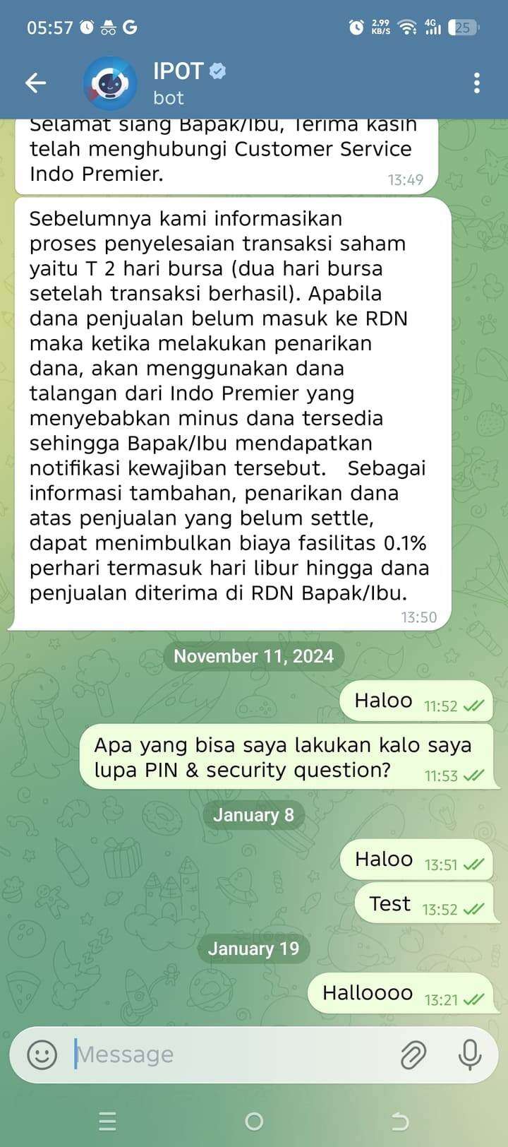 Saya adalah pelanggan Indo Premier Sekuritas sejak 2018. Pada awal Januari 2026, karena HP lama saya mengalami kendala, saya mengganti HP. Sekitar tanggal 8 Januari 2026, saya mencoba login ke aplikasi IPOT di Android, tetapi gagal karena device tidak terdaftar. Pada saat itu, saya menghubungi IPOT via Telegram bot dan tidak ada respons (sedih kan, bot saja tidak mau balas).