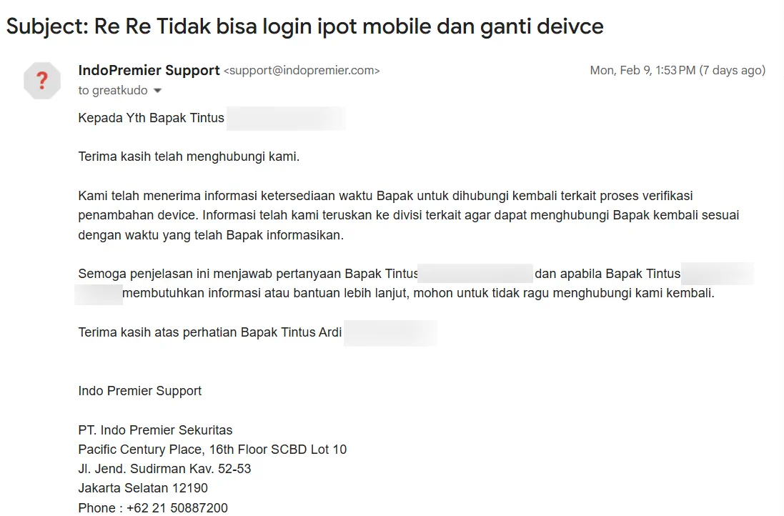 Saya reply kembali dan informasinya akan dihubungi oleh customer service via telepon untuk proses reset akun. Namun, hingga saat ini tidak ada customer service dari Indopremier yang menghubungi.