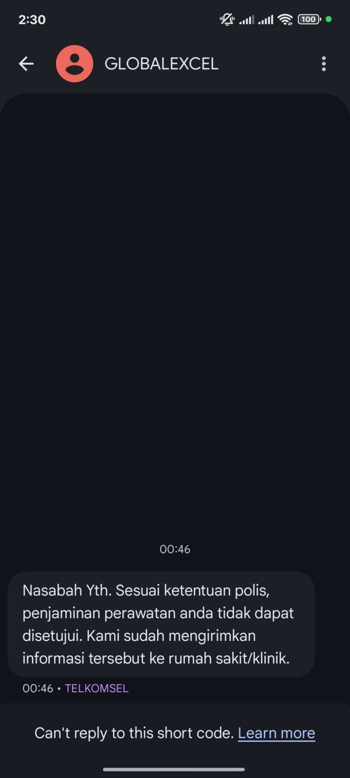 Namun pada 27 November 2025 pukul 00.46 (iya, kalian tidak salah baca, jam setengah satu malam), pihak Global Excel Indonesia mengirimkan SMS kepada saya bahwa status penjaminan istri saya tidak dapat disetujui.