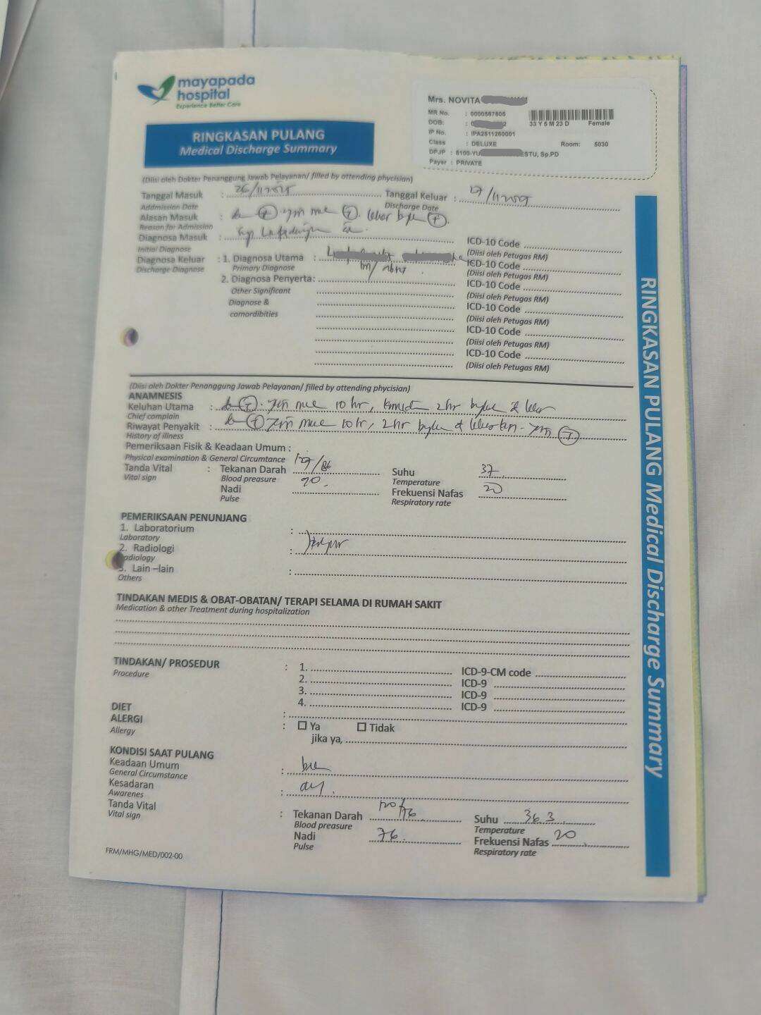 Pada pagi harinya, pihak rumah sakit memberikan selembar kertas bersifat rahasia yang menyatakan bahwa mereka tidak dapat menjamin biaya perawatan karena “belum memenuhi kriteria indikasi rawat inap”.