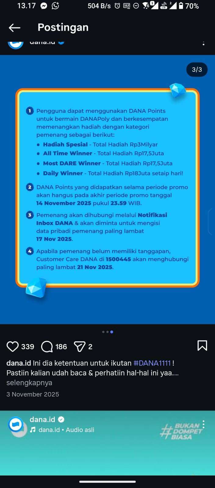 - Satu kali daily winner peringkat 3 berhadiah saldo DANA 3 jt (periode 11 Nov)