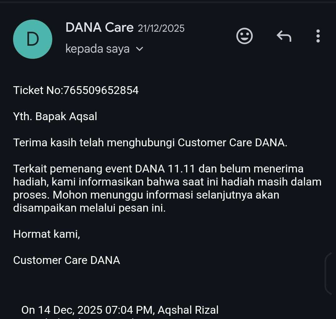 - Follow up sejak bulan Desember ke CS DANA hanya mendapatkan jawaban “masih proses”, email template, jawaban tidak sesuai kronologi bahkan sempat diklaim kalau hadiah sudah dibayarkan seluruhnya.