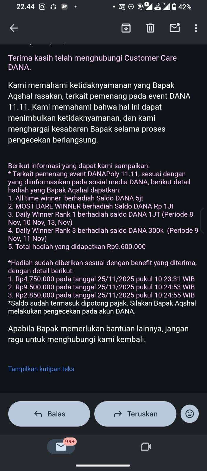 - Total hak saya sebagai pemenang belum dibayarkan oleh DANA sebesar Rp24.000.000 (sebelum pajak) dari event DANAPoly 11.11 tahun 2025, sedangkan peserta lain sudah menerima haknya.