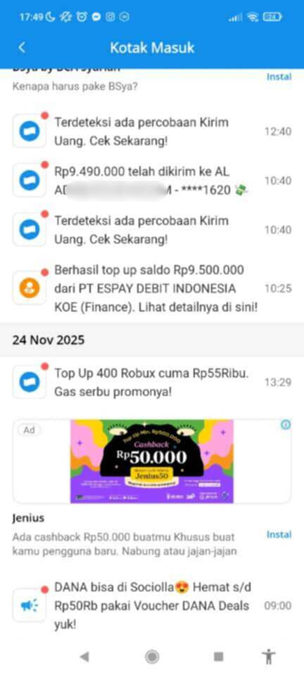 - Tiga kali menang daily winner peringkat 1 berhadiah saldo DANA 10 jt (menang periode 8 Nov, 10 Nov, 13 Nov)