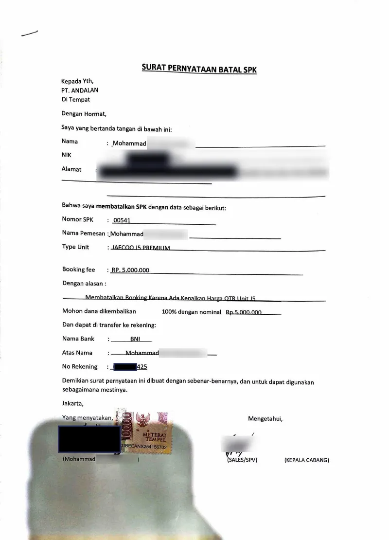 Januari 2026: Saya diinformasikan oleh pihak sales bahwa akan ada kenaikan harga. Karena tidak setuju dengan kenaikan tersebut, saya memutuskan untuk membatalkan SPK sesuai hak saya yang tertera di kontrak.