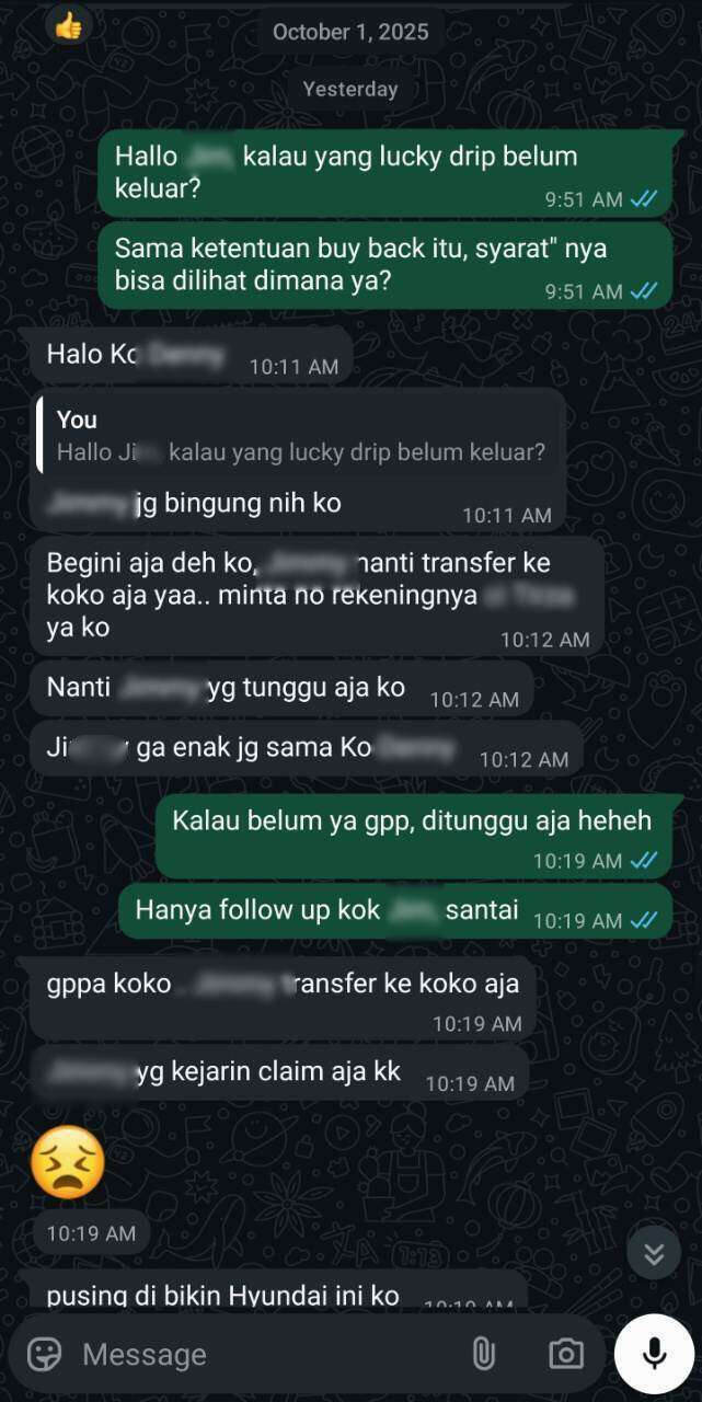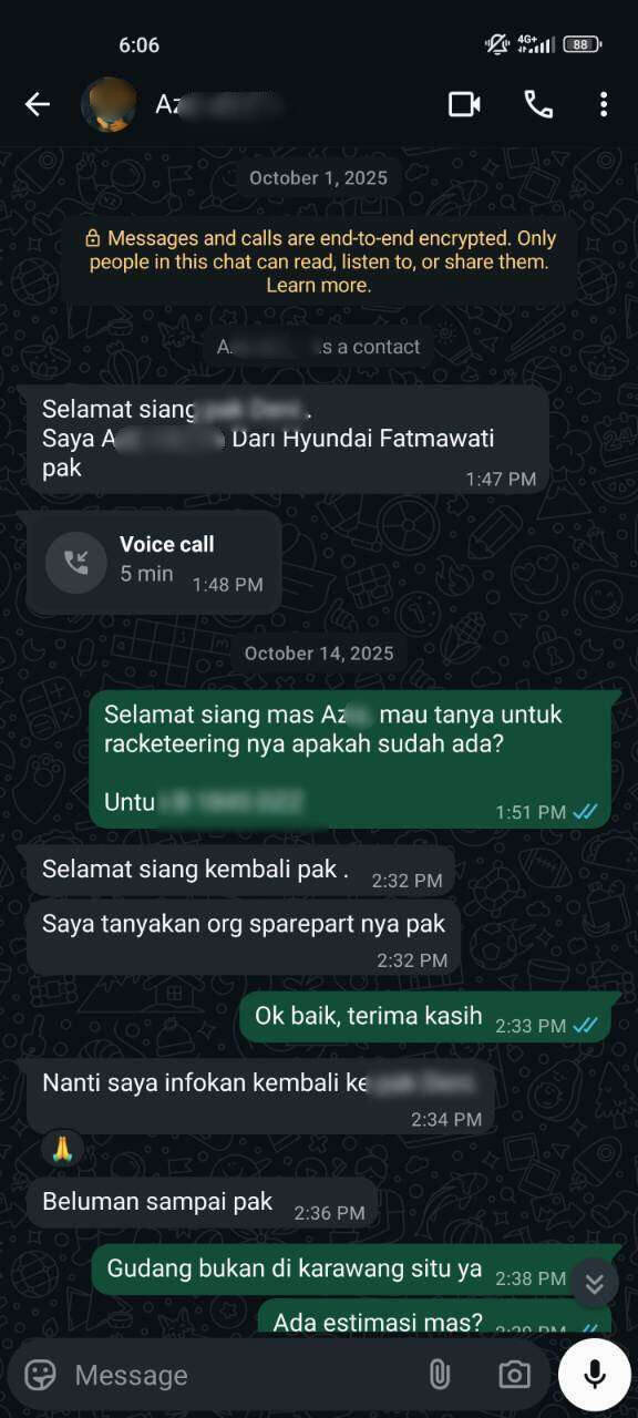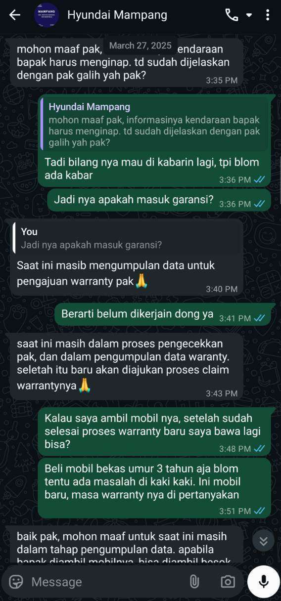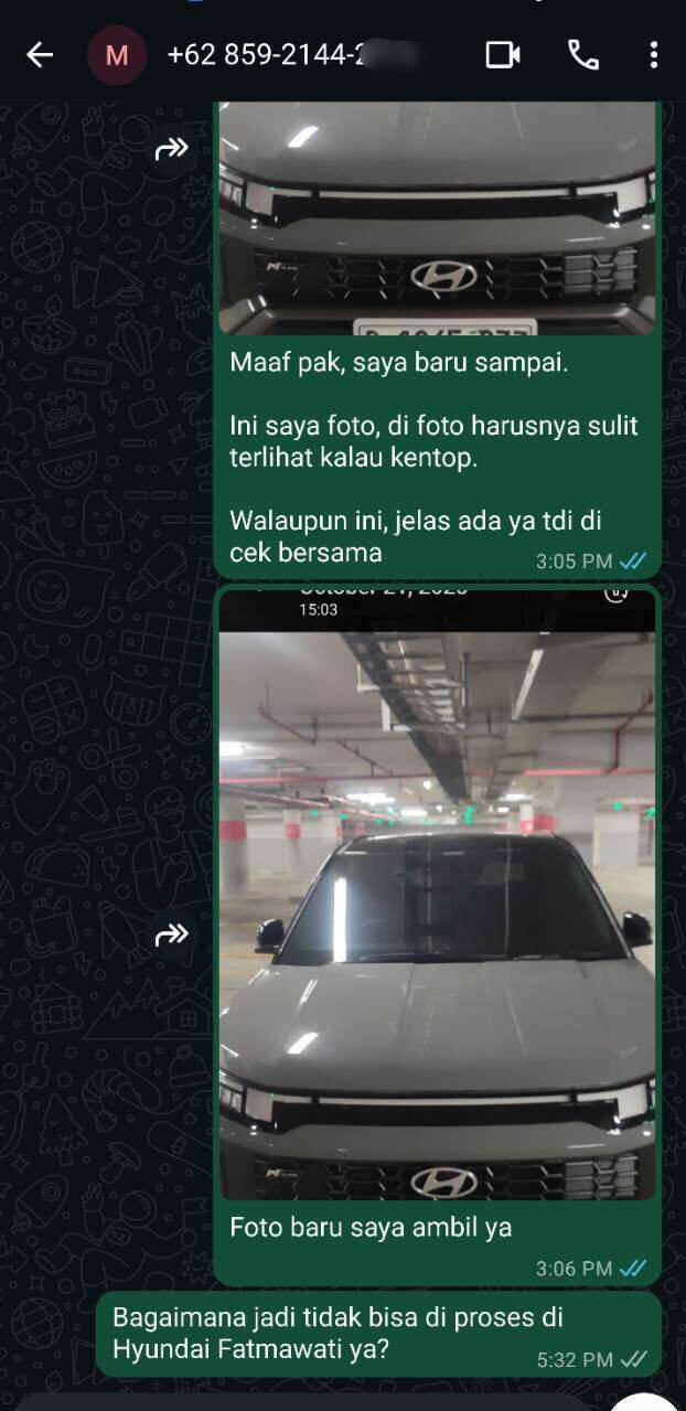 Ambil mobil di bengkel, kap mesin tengah penyok → bengkel Hyundai Fatmawati Gowa awalnya setuju untuk bertanggung jawab, namun saat saya di jalan pulang, pihak bengkel melalui WhatsApp tidak mau bertanggung jawab.
